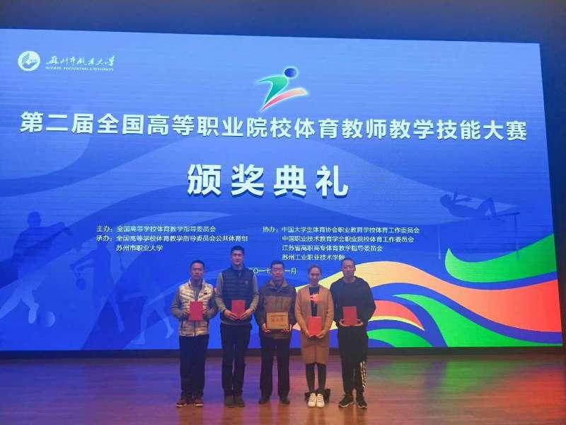 2017年11月23日-11月27日,由社科部副主任王复生带队,中职分院体育教研室丁雷、杨凯两位老师代表兵团参加在江苏苏州举行的第二届全国高等职业院校体育教师教学技能大赛,其中丁雷老师获得教学技能大赛二等奖,杨凯老师获得教学技能大赛三等奖、《教学设计与实践 说课与微课》比赛三等奖,再为学院创造新的荣誉!