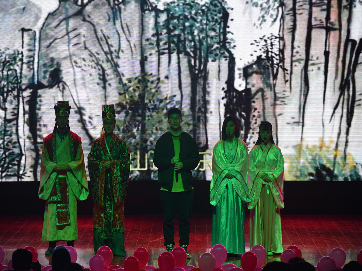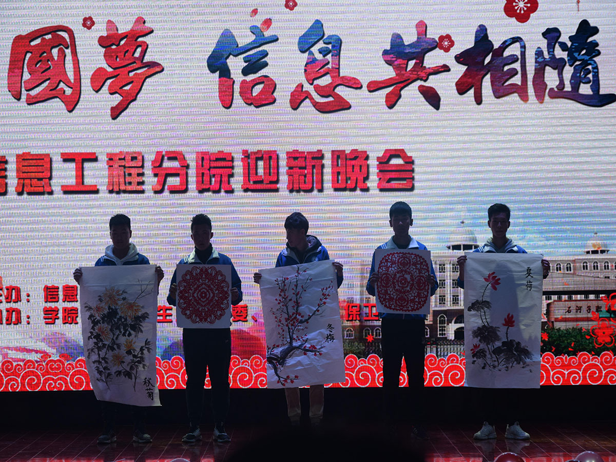 晚会由一曲男生二重唱《大中国》拉开了帷幕。歌伴舞《凉凉》不仅唱得好,也舞出了同学们的青春身姿,孙泽凯和孙洁同学带来的男女声合唱《不忘初心》更唱出了分院学子们对党和祖国的深深热情,志愿在党的十九大绘制的宏伟蓝图上留下自己青春的印记。在接下来的获奖同学专访中,全国职业技能大赛兵团比赛的二等奖、国家奖学金获得者张海洋同学语言平实真切,说出获奖感言的同时也宣传了国家和学院的奖助学金政策,让同学们感受到榜样就在身边,努力付出就一定有回报。分院兵团传统文化素养大赛选手石月同学的国画和张晓玉同学的剪纸作品分送给了在场的领导及嘉宾们,她们的献技把晚会拉上了一个小高潮。今年分院歌手大赛中获奖的张博阳、李浩楠、沈永祺等同学演唱的歌曲串烧《怀念》用歌声完美诠释了校园时光。一曲《再唱山歌给党听》唱出了分院同学们的心声,今天的幸福生活来之不易,更要加倍努力,方得始终,大家都陶醉其中。防艾话剧《青春,要爱不要艾》讲述的是社会对艾滋病的偏见认识,大家从不理解、惧怕,到掌握知识、关爱病患的巨大转变,吸引着每个人的心弦。配乐诗《东风破》是一次歌曲与诗词的对话,也是一次现代青年与古代文人的交流,通过一首歌和几首诗词的穿插,弘扬中华传统文化。最后,学生会及计网171的同学们合唱《强军战歌》,通过合唱的形式,凝心聚力,让大家一起撸起袖子加油干。街舞社团的同学们,用欢快的街舞掀起晚会高潮,让大家意犹未尽。