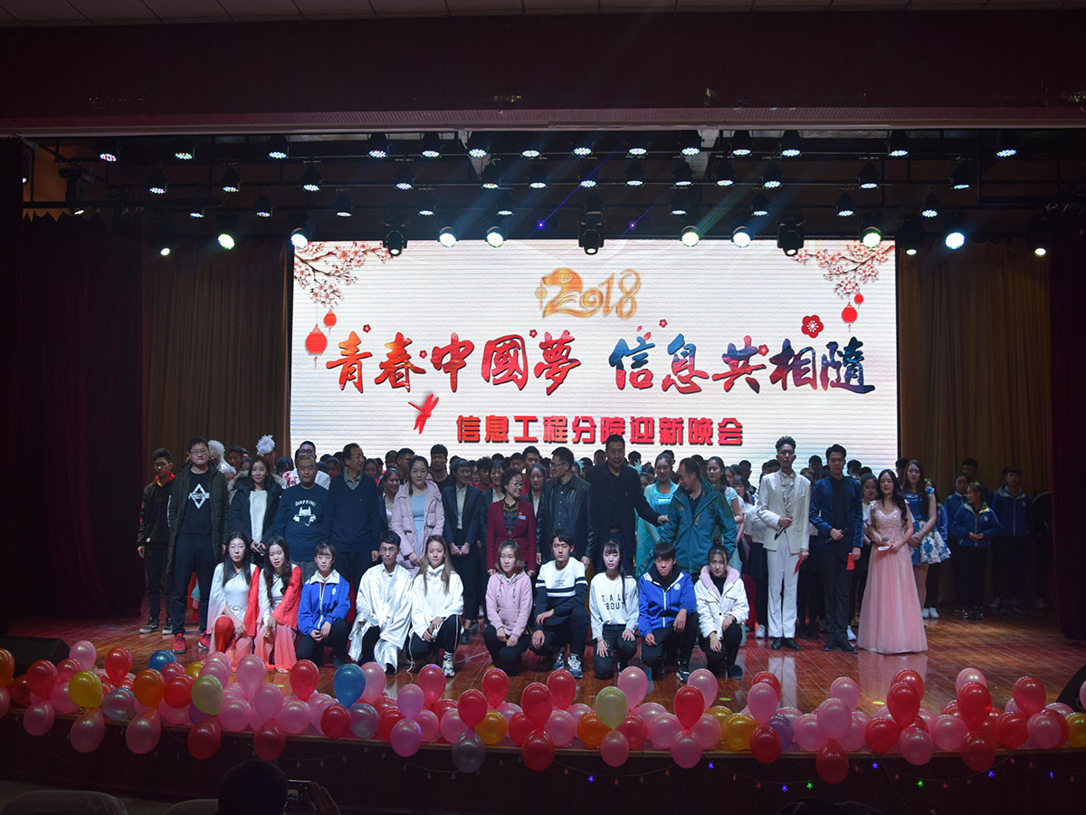 青春无悔为圆中国梦,开拓创新一起跟党走,信息工程分院为丰富广大师生校园文化生活,迎接2017级新同学,迎接新年新气象,12月22日下午17时整,在学院阶教四楼演艺厅举办迎新晚会,学院党委书记陈建丽、院长王敏弦、副院长李卫、纪委副书记李国新,学院各分院及部门领导、老师参加了晚会。
