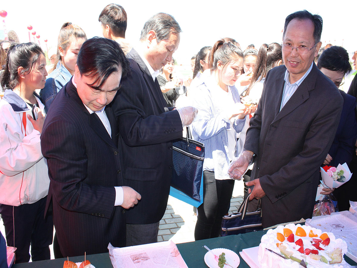 图为领导嘉宾品尝学院校企合作单位泰和公司糕点产品