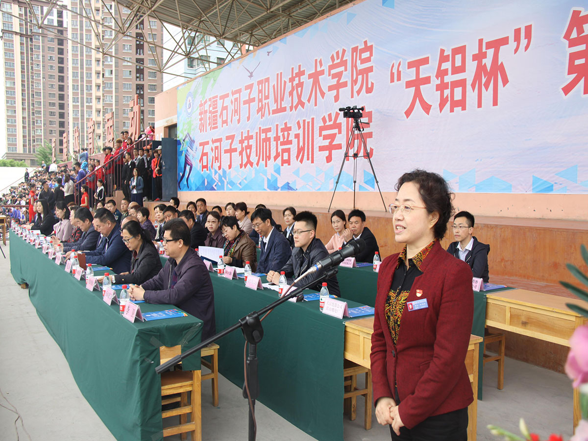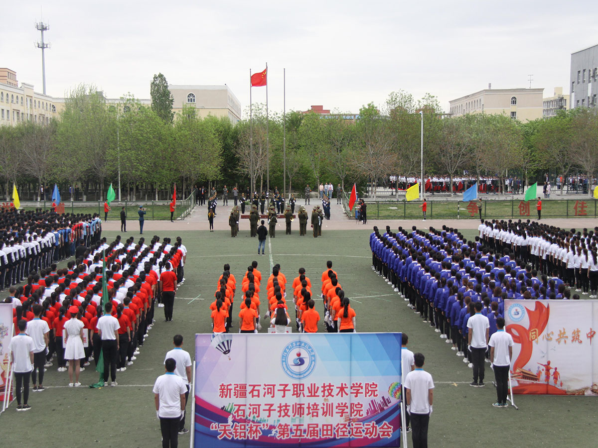 4月26日上午10:00,beat365唯一官方网站人海如潮,彩旗招展, “天铝杯”第五届田径运动会在学院田径场正式开幕。出席本次运动会开幕式的领导有石河子市副市长乐旸、八师石河子市副秘书长宋晨光、师市总工会教育工会主席芦琴、师市团委副书记甘哲、师市文体局副局长杨延东、师市司法局副调研员刘延年、八师检察分院专职委员邹宁、师市教育局职成教科副主任科员王红军、师市劳动就业管理局人力资源服务中心主任吴晶、高新区管委会社发局局长刘彩霞、东城街道办事处副书记满仁山、开发区公安分局办公室主任李海荣等,师市各单位、兄弟院校部分领导、军民共建单位、部分校企合作单位代表参加了开幕式。开幕式由学院副院长李卫主持。
