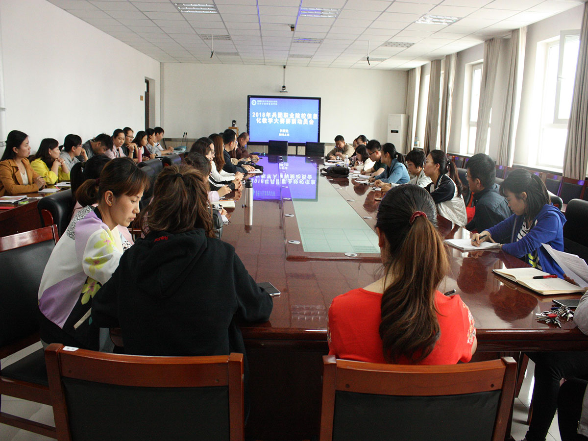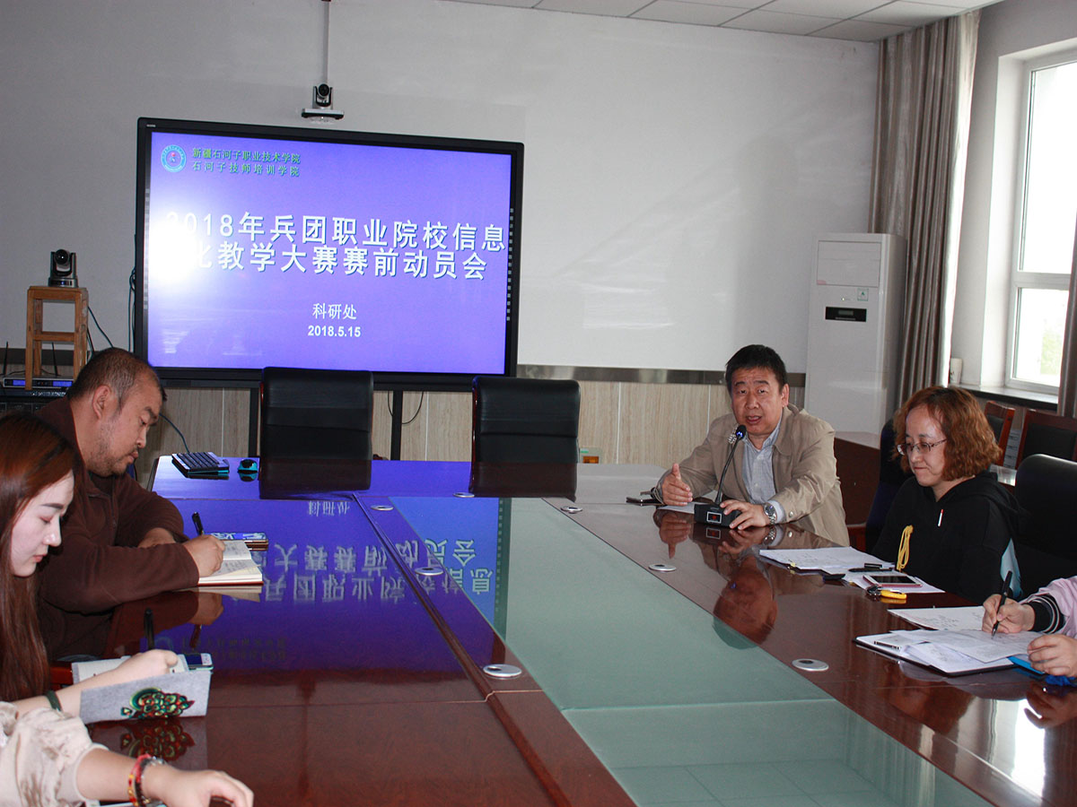5月15日下午6点,在学院培训中心四楼会议室,由科研处组织召开2018年兵团职业院校信息化教学大赛赛前动员会。会议由科研处处长张海轮主持,学院院长王敏弦、学院信息化教学大赛评委会成员及参加兵团职业院校信息化教学大赛的参赛老师们一同参会。