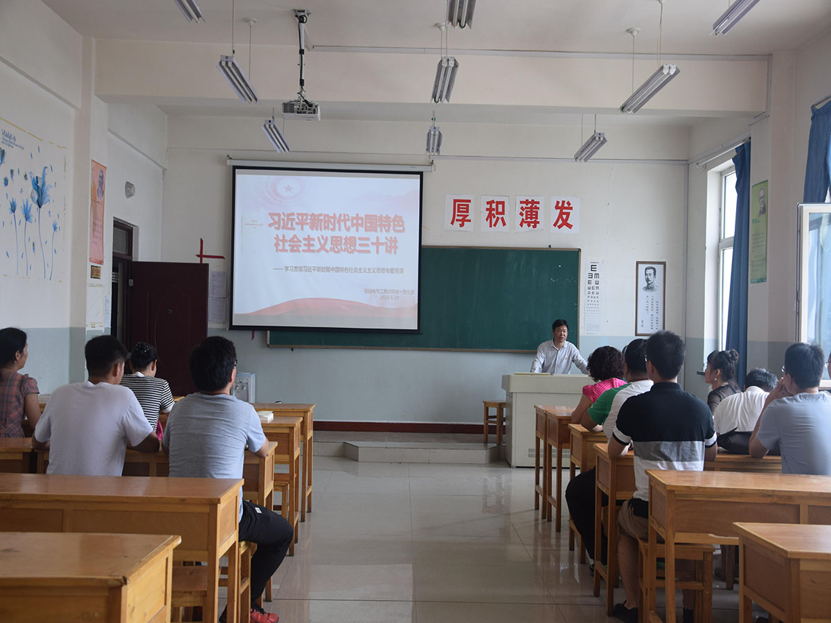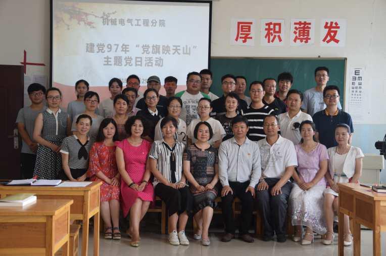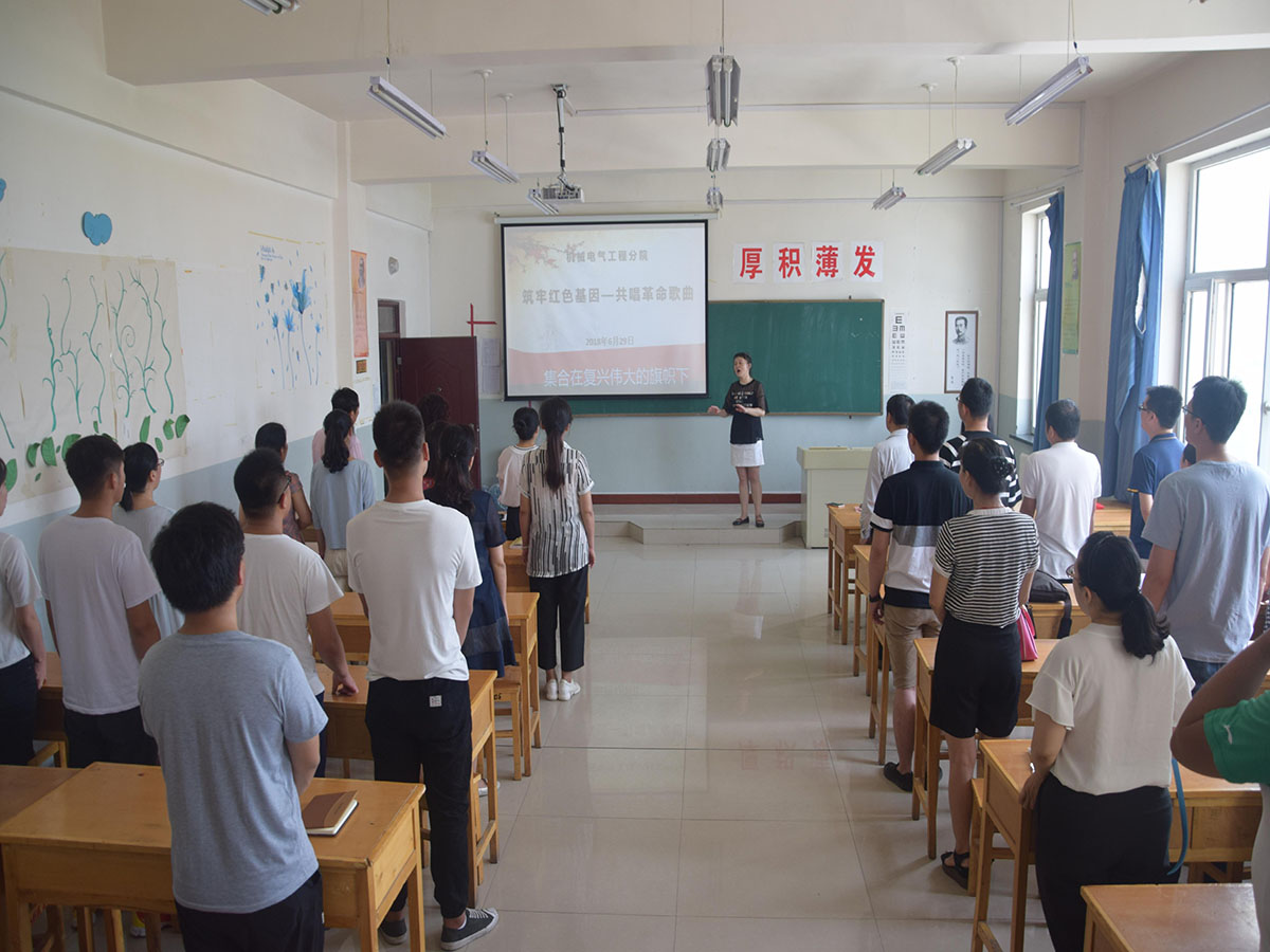 2018年6月29日上午,机电分院409教室党旗飘扬,红歌荡漾。机电分院30名党员教师、5名学生预备党员在这里欢聚一堂,隆重庆祝中国共产党成立97周年,开展了重温入党誓词、共唱红色歌曲,同上主题党课活动。机电分院胡英书记出席并主持活动。