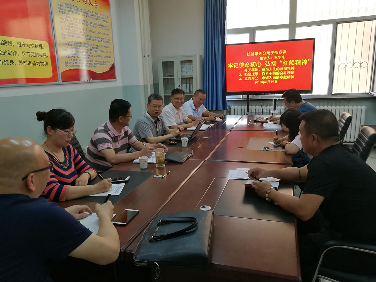 为全面贯彻党的十九大精神,全面加强基层党组织的建设,不断创新工作思路和工作方法,促进党风廉政建设,坚定不移沿着中国特色社会主义教育道路前进,坚持“三会一课”制度,积极认真的上好每一次党课,培训分院直属支部在院党委的指导下,于2018年6月19日下午在培训分院会议室,由学院领导王华东副院长主讲了题目是《牢记使命初心,弘扬“红船精神”》的专题党课。