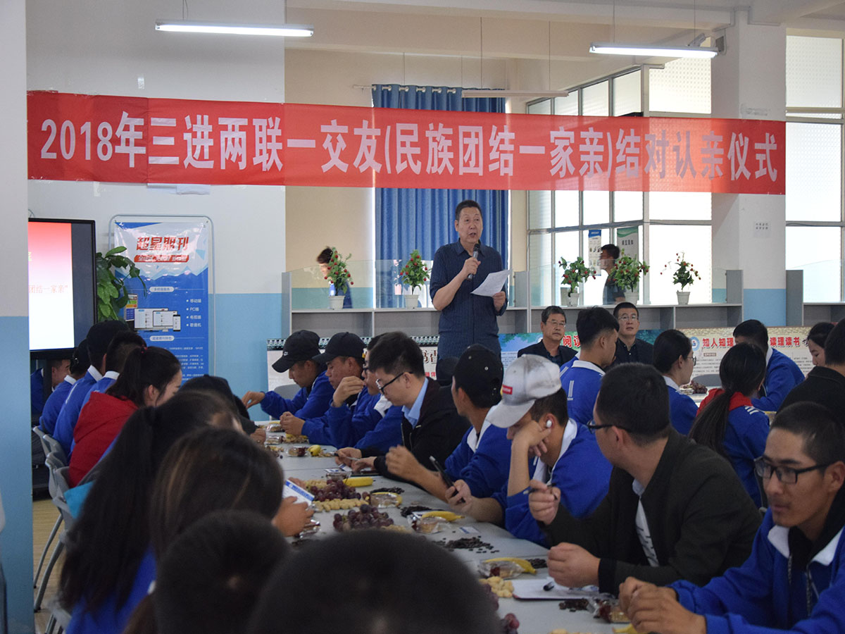 分院的两名少数民族学生代表阿布都·沙拉木和艾山江·阿布拉进行了发声亮剑发言。随后2018级新同学带来的歌曲演唱、少数民族同学跳起民族舞蹈,把结亲仪式推向了高潮。结亲的老师和同学认真填写连心卡,互相了解彼此情况,结亲师生合影留念,师生的情谊从一张张热情的照片开始。