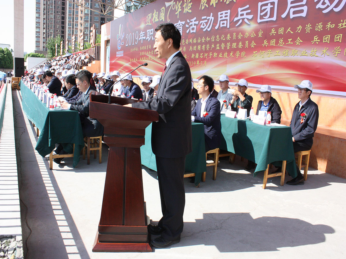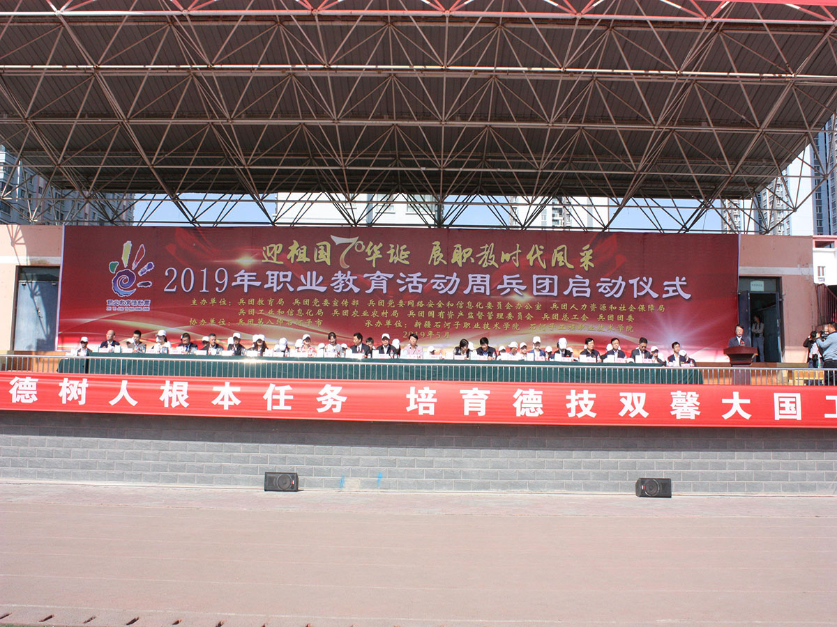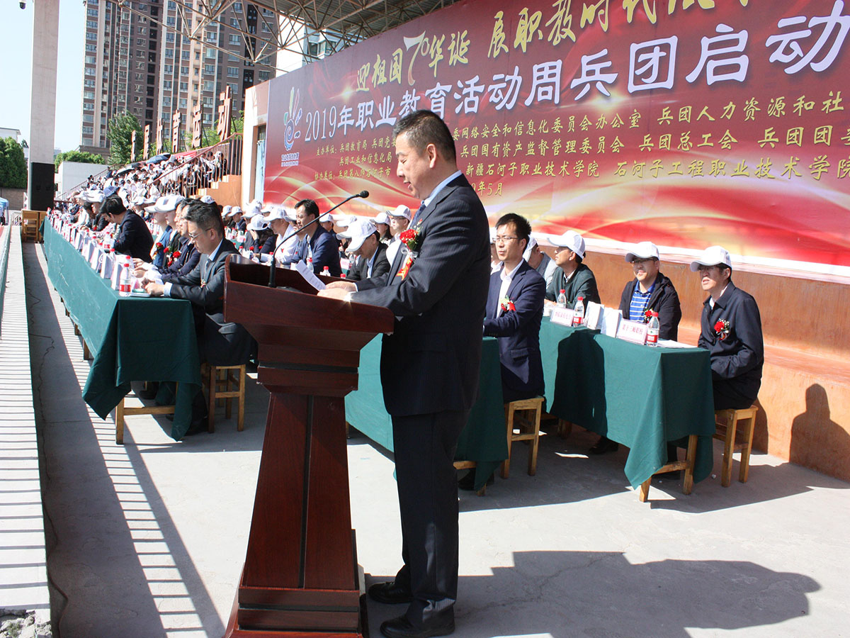 5月10日上午,由兵团教育局、兵团党委宣传部、兵团人社局、兵团工信委、兵团团委主办,第八师石河子市教育局、第八师石河子市党委宣传部、第八师石河子市人社局、第八师石河子市工信委、第八师石河子市团委协办,beat365唯一官方网站、石河子工程职业技术学院承办的2019年职业教育活动周兵团启动仪式在beat365唯一官方网站运动场举行。主办单位相关部门领导,20多家兵团职业院校负责人、30余家企业代表、200余名社区工作人员及各院校学生、学院全体教职员工及学生参加了启动仪式。兵团教育局副局长刘培俊出席仪式并讲话,八师副师长刘新铭致贺词,八师石河子教育局局长孙力军主持仪式。