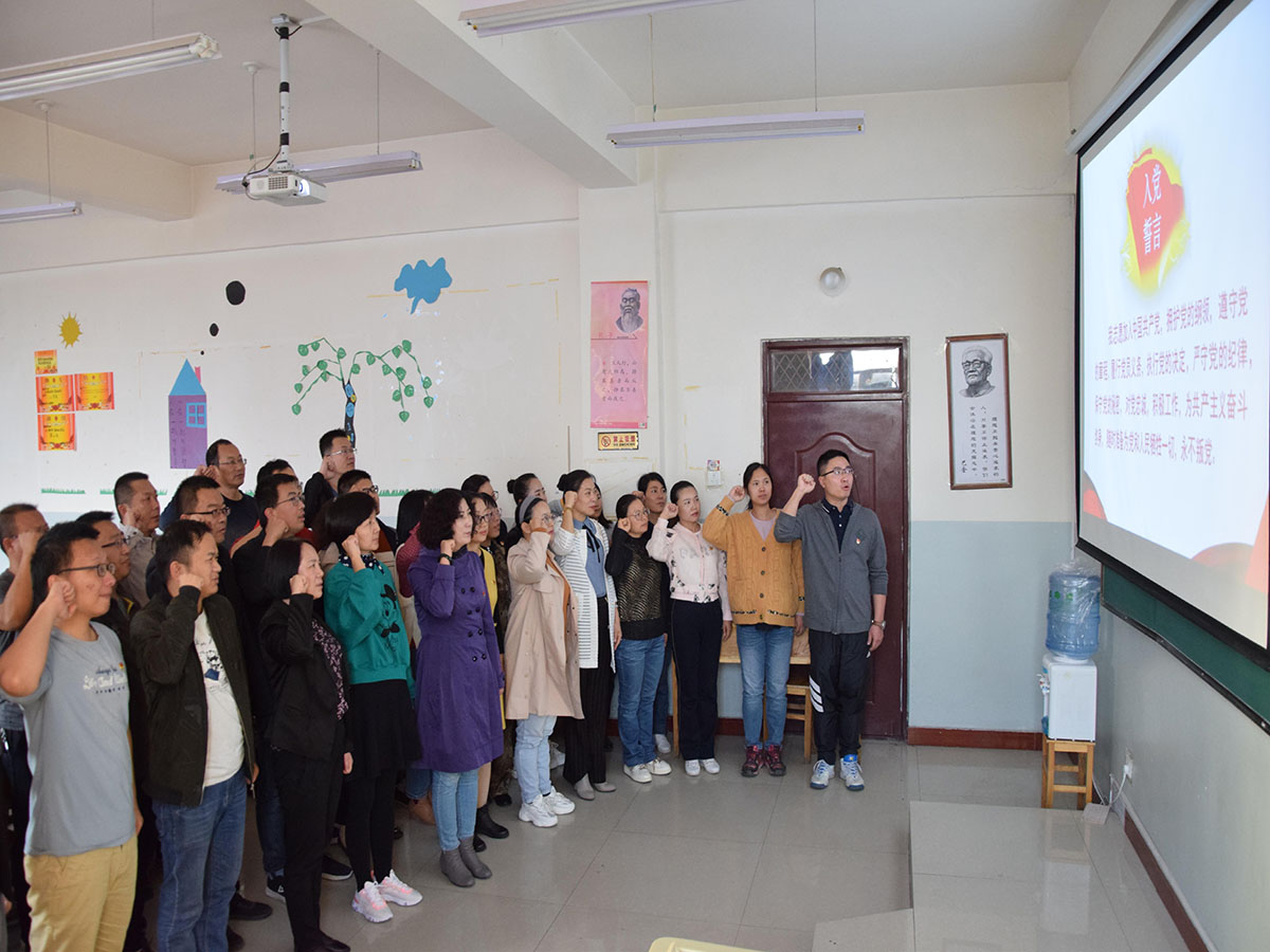 活动第二阶段,全体党员重温入党誓词。大家笔直肃立,庄严地举起右手,面向党旗,通过铿锵有力的入党誓词,再次表达出对党的忠诚和热爱。