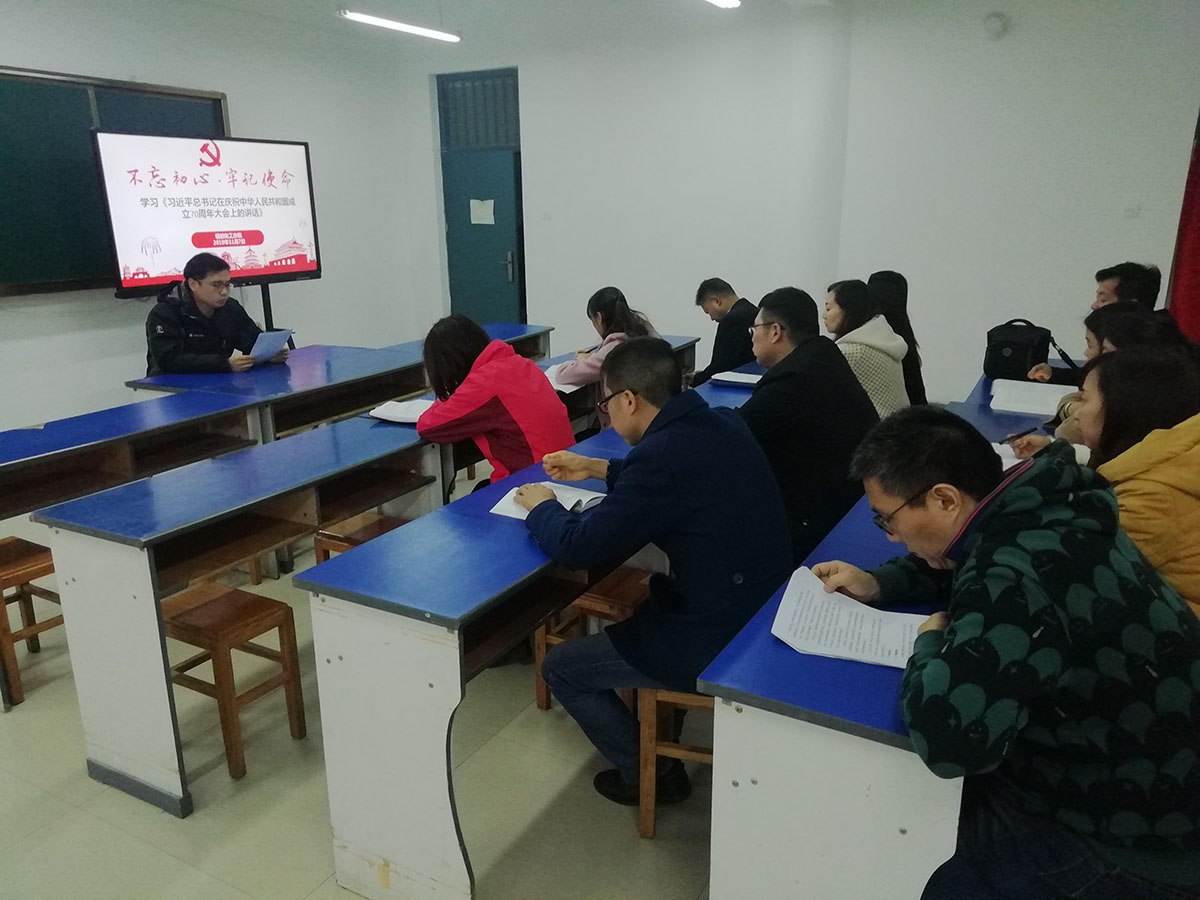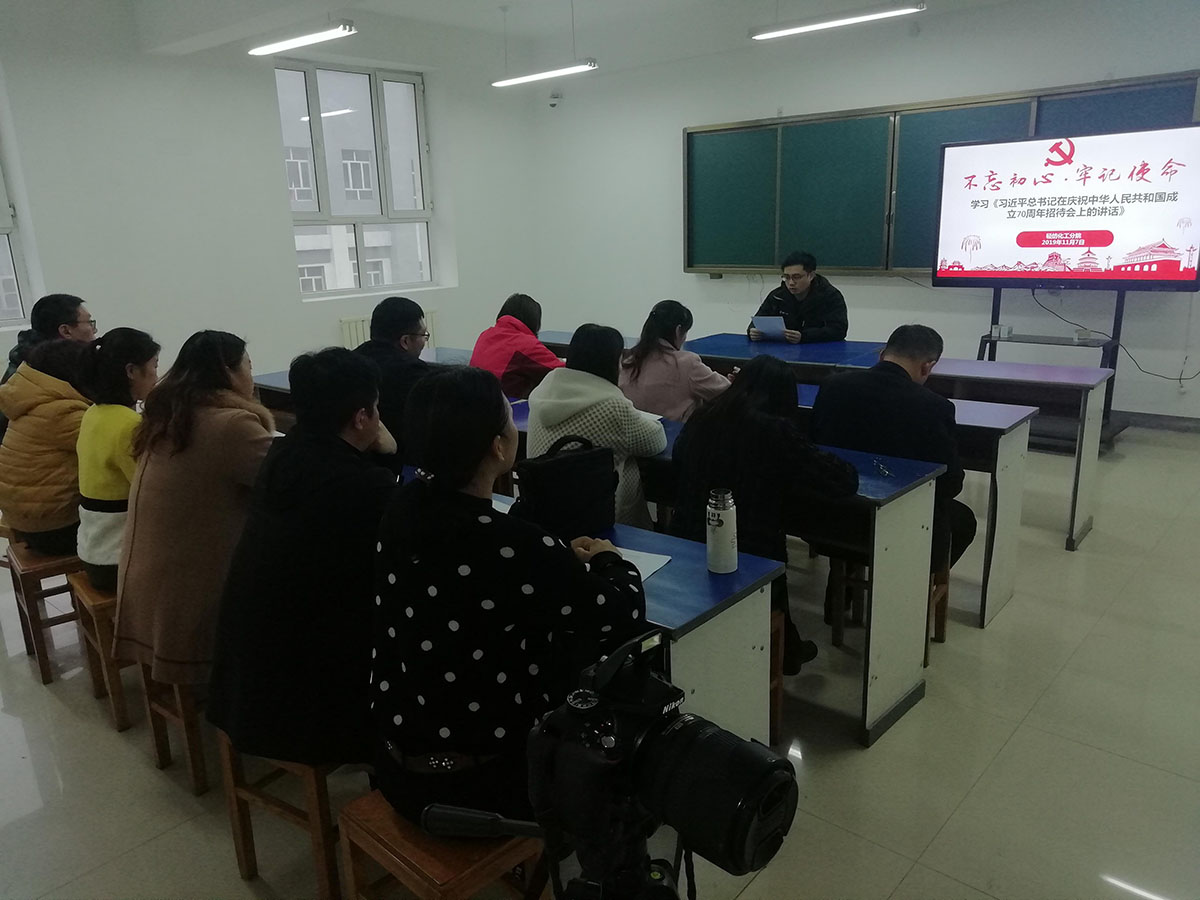 11月7日,轻纺化工分院组织全体党员教师认真学习了《习近平总书记在国家荣誉称号颁授仪式、庆祝中华人民共和国成立70周年招待会、庆祝中华人民共和国成立70周年大会上的重要讲话》。习近平总书记在讲话中强调,……“在新时代创造中华民族新的更大奇迹!创造让世界刮目相看的新的更大奇迹!”必须依靠我们每一个人立足岗位、脚踏实地、担当实干、务实创新。贯彻落实好习近平总书记所做的工作讲话就是要求我们提高政治觉悟和政治站位,牢固树立四个意识,增强不忘初心,砥砺前行的信心和力量。