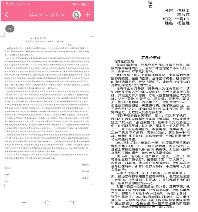 征文活动期间,分院收到了来自各团支部60余名同学的投稿征文,经过专业老师的评审,最终有6篇较为优秀的征文脱颖而出,将在正式开学后向全院师生展出;同时还开展了线上诗歌朗诵比赛活动,分院全体同学积极参,同学们用自己的方式,一同缅怀逝去的英雄——那些奋战在一线的医生、护士,向疫情期间一直在不间断巡逻的民警,不远万里送物资的英雄们致敬!