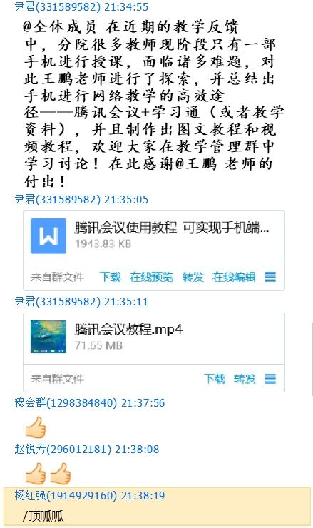 针对这些问题,王鹏老师结合软件教程以及自己的使用体会,在分院QQ群、微信群、钉钉群中以文字和图片的形式耐心为其他老师讲解,帮助他们解决网络授课问题。同时,他积极与学习通、钉钉的技术售后进行沟通,通过自己在学习和使用过程中的体会以及其他老师的反馈,摸索和归纳出了钉钉、学习通、腾讯会议等网络平台的使用技巧和注意事项,编写了一份“机电分院网络教学平台使用手册”。