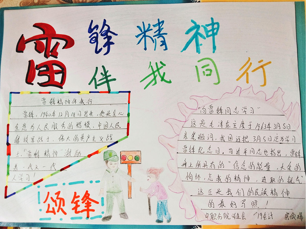 同学们纷纷拿起画笔,以手抄报的方式传递雷锋精神,书写正能量,表达对党和国家的诚挚热爱,对“最美”逆行者的无限敬意和对战“疫”必胜的坚定信心,表示在新时代要继续以雷锋为榜样,好好学习,乐于助人,继续弘扬和传承雷锋精神以及“奉献、友爱、互助、进步”的志愿服务精神,练就过硬技能,弘扬工匠精神,为实现“两个一百年”奋斗目标贡献自己力量。