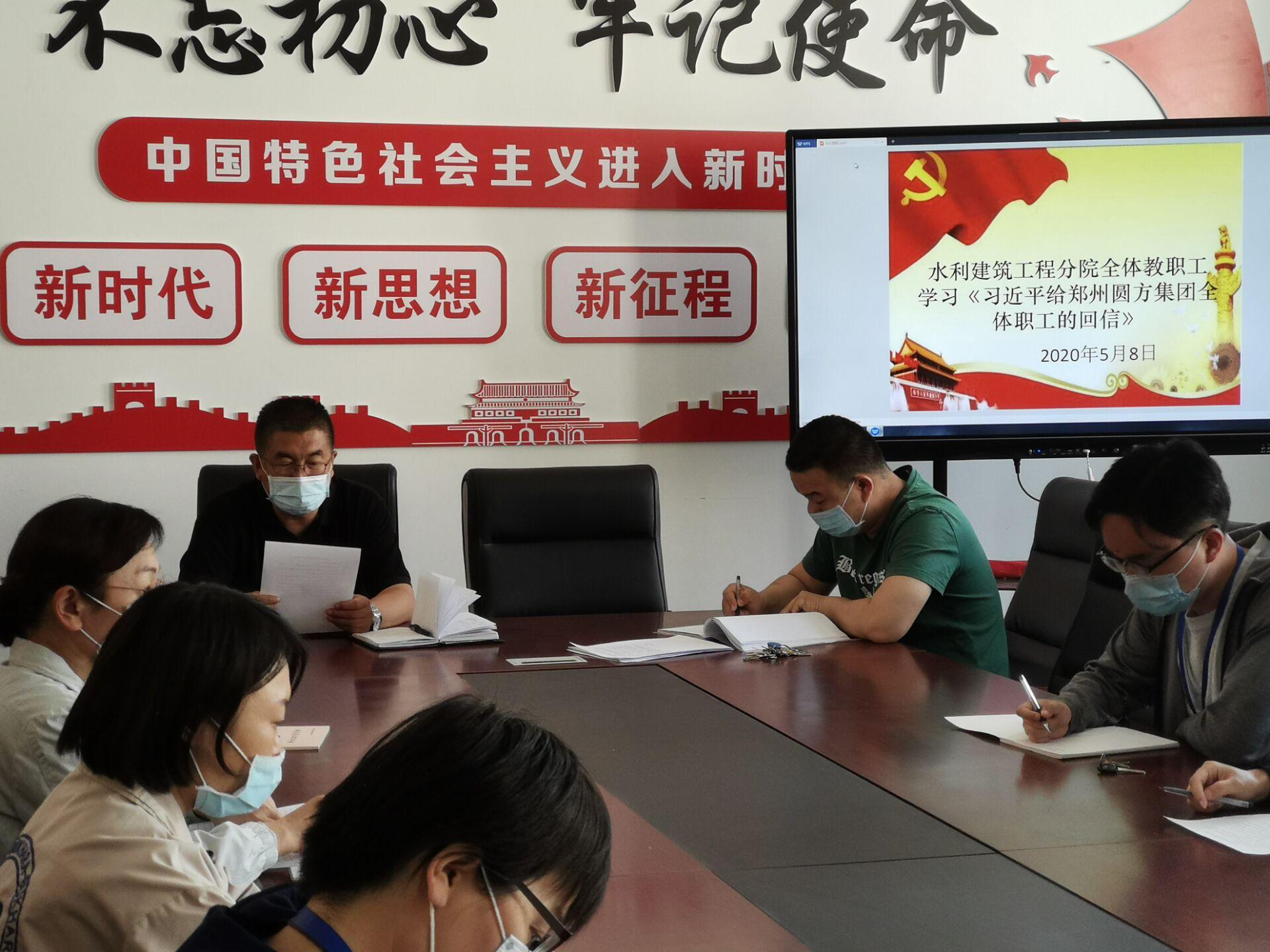 2020年5月8日下午16:30分,分院党总支书记俞峰带领水建分院27名教职员工在318(党员活动室)学习了《习近平给郑州圆方集团全体职工的回信》,在学习现场,分院三位青年教师依次发言,李通老师说:劳模作为一面鲜明的指导性旗帜,学习劳模先进事迹,大力弘扬劳模精神,对于培养和塑造广大员工的集体荣誉感与使命感,增强企业向心力与凝聚力,激发广大员工的热情与活力,都有着十分重要的作用和意义。