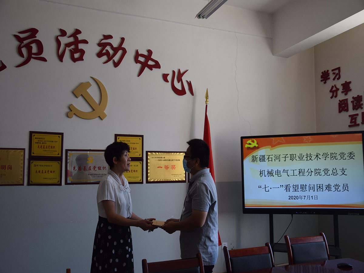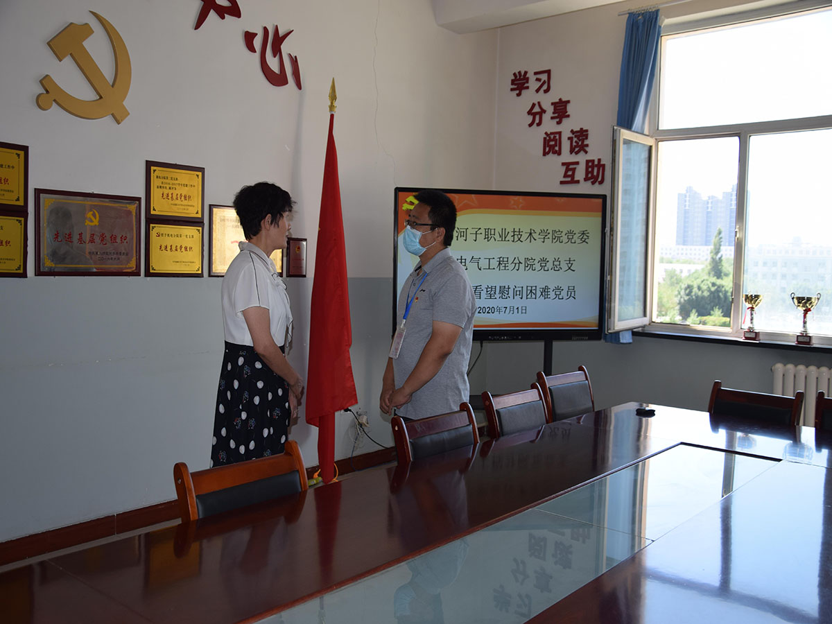 2020年7月1日,在党的第99个生日到来之际,学院纪委书记周赞梅书记代表学院党委来到机电分院,在机电分院书记辛延波、副院长尹君等人的陪同下带着党的关怀和温暖,慰问生活困难分院党员王民同志,向他送上了节日的祝福和亲切的问候。