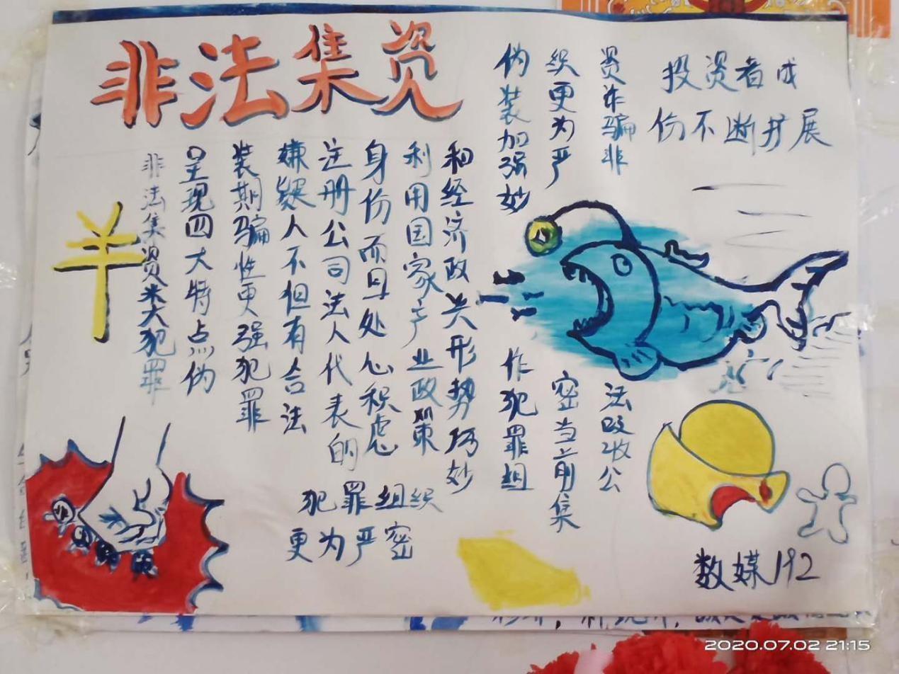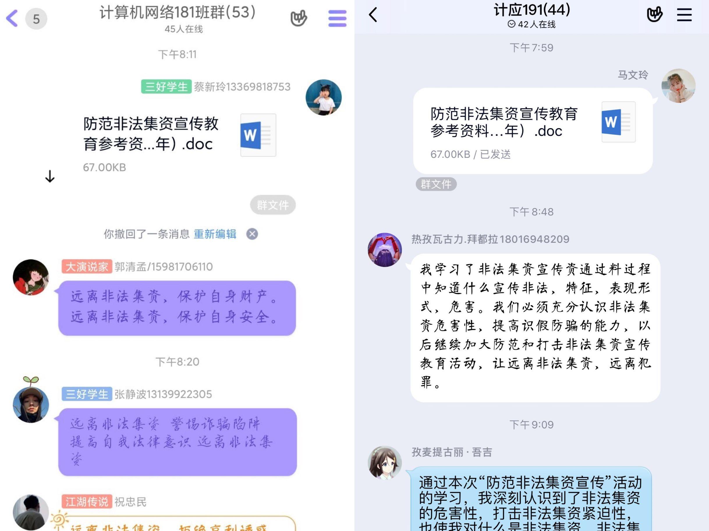 分院全体师生1048人共同参与了本次学习活动,活动通过主题班会、绘画黑板报或墙报、发放非集资案例的传单、在班级群内发表学习留言等多种形式展开。通过活动的深入开展,同学们抵御非法集资活动的意识与能力得到了提高,防范意识进一步加强,对于新型诈骗手段有了清晰的认识。分院全体教职工也同时开展了关于“防范非法集资”的集中教育学习,切实增强了广大教职工防范非法集资的意识,提高识假防骗的能力,充分发挥宣传工作“震慑犯罪、树立形象、教育公众、防范风险”的积极作用。