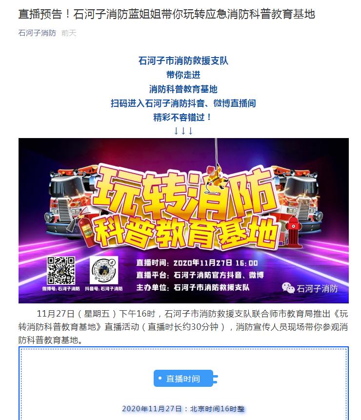 11月27日(星期五)下午16时,石河子市消防救援支队联合师市教育局推出《玩转消防科普教育基地》直播活动消防宣传人员现场带你参观消防科普教育基地。