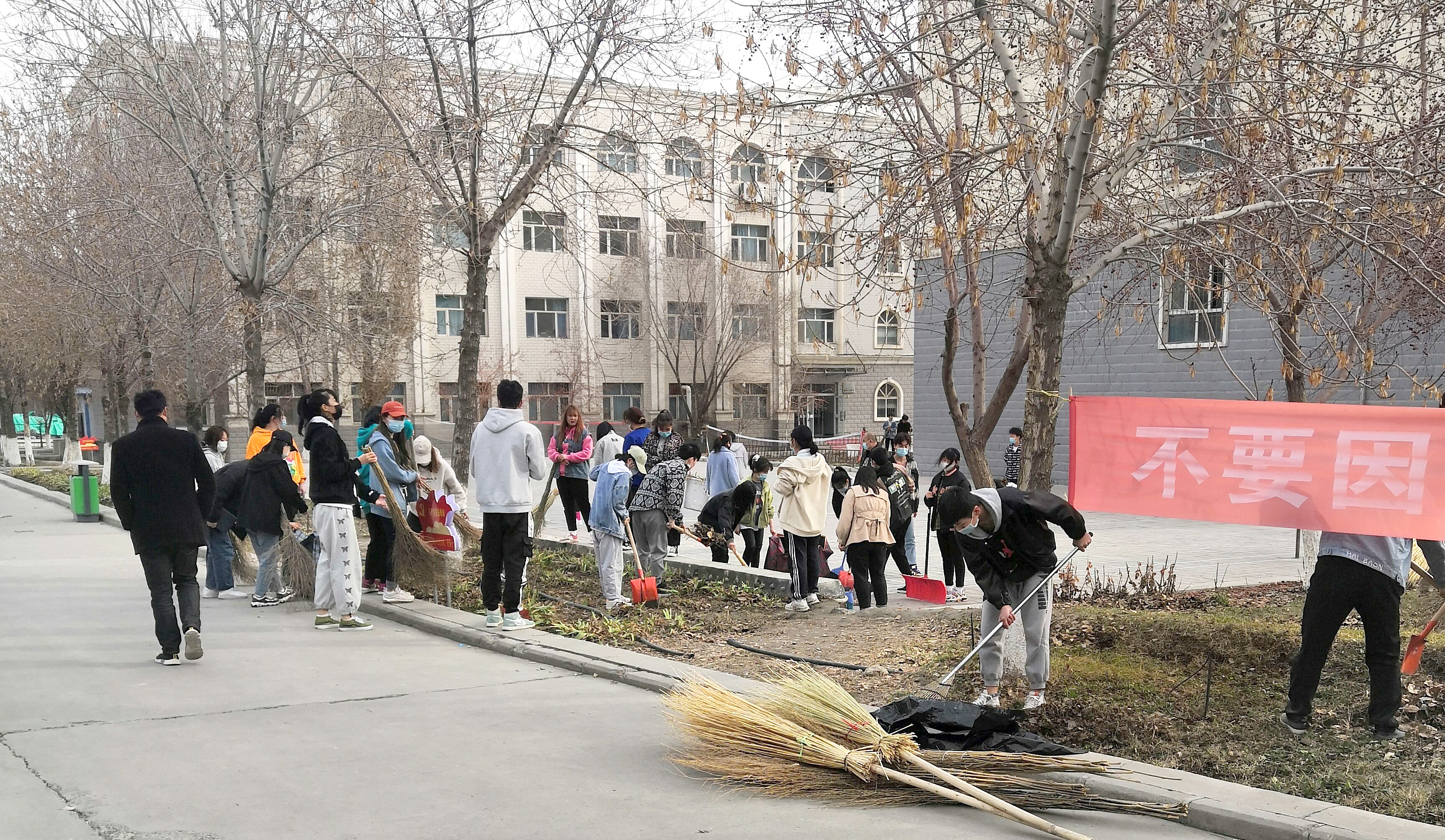 活动当日,分院全体教师带领各班学生,共计33个班级1538人,一同参与了校园大扫除活动。在清洁过程中,班主任首先对同学们进行了明确的分工,同学们有明确目标后紧接着进入工作状态,一部分同学负责用铁锹清理杂草和乱石,另一部分同学负责将隐藏在积雪下的杂物、落叶、树枝及垃圾彻底清扫,同时部分女同学对信息楼及后楼室内的卫生死角也进行了彻底清洁,做到了分院室内外环境卫生区清扫全覆盖,不留死角。同学们也在劳动中进一步传承和发扬了无私奉献、乐于助人、艰苦奋斗的雷锋精神。虽然“与尘土齐飞”,但是每一位同学脸上都洋溢着快乐的笑容。