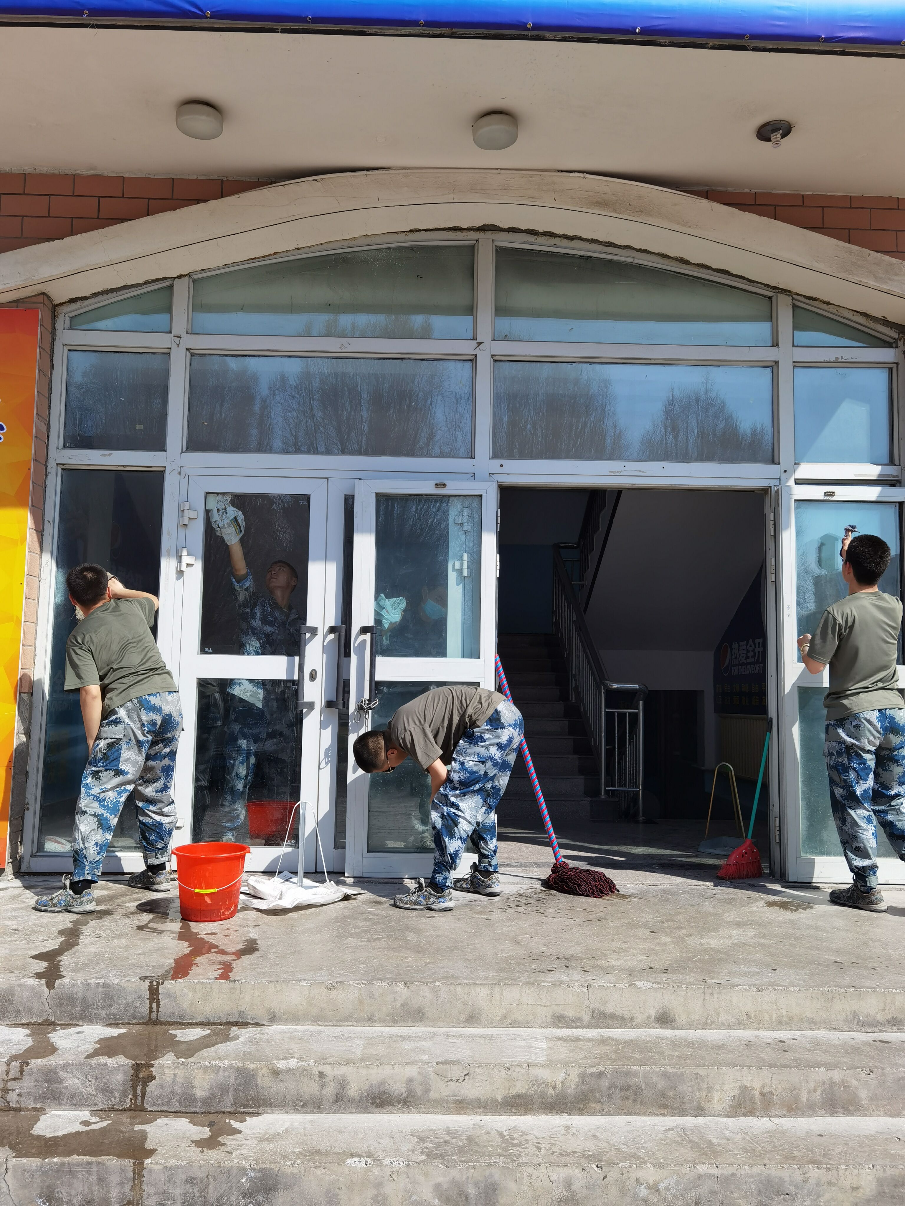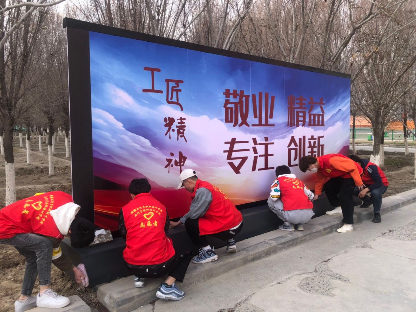 4月11日下午,志愿者们积极行动起来,清洁美化校园,每块宣传牌擦洗一尘不染,每条道路清扫干净。为参加赛选手们提供干净舒适的环境。