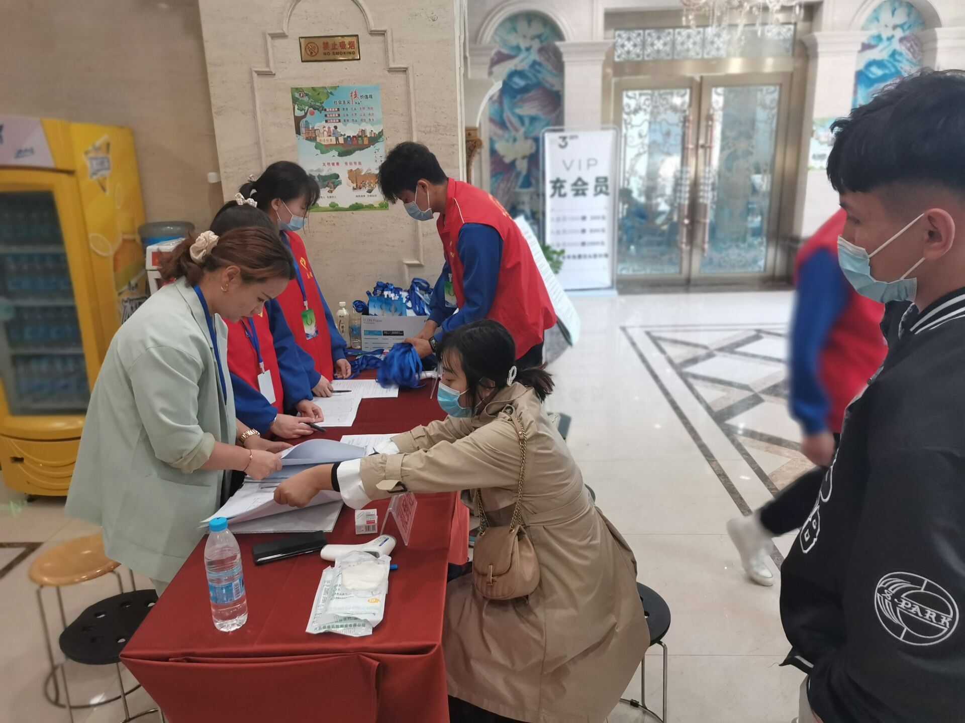 4月12日,早早列队做好赛前服务工作的同学们和前来参加领队会的各地区领队及前来熟悉各赛点儿的选手们。