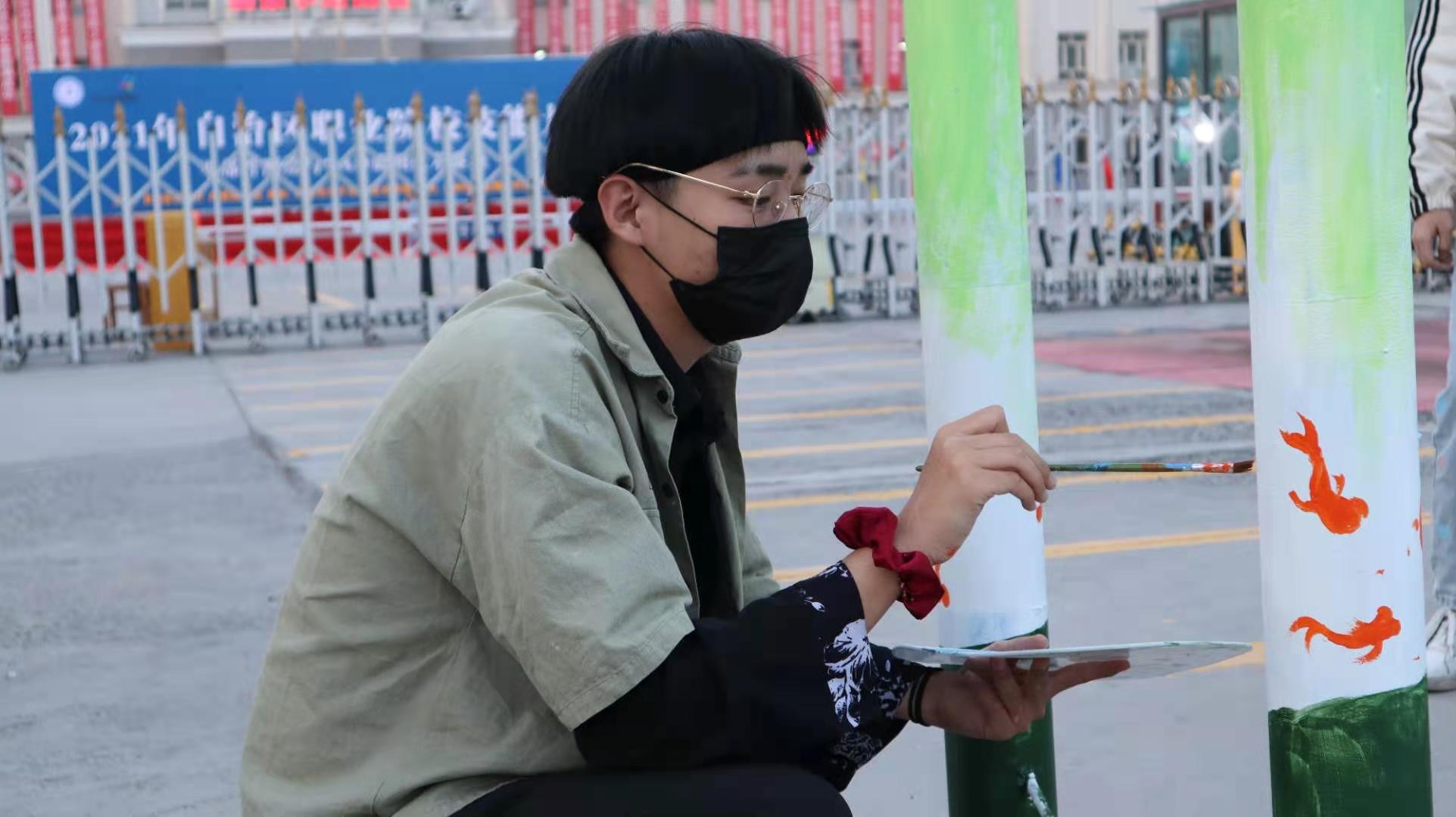 在分院教师周俞彤和陈峙米老师的带领下,数媒191和192班的同学们,拿起画笔,将心中的创意绘制在围栏上,绿色的叶片、湛蓝的天空、清澈的白云,每一幅画都生动有趣,将冷冰冰的栏杆变的生动有趣起来。即使颜料和尘土将同学们的衣服弄脏,也阻止不了同学们想要美化校园的心,保质保量完成了美化校园的任务。他们的脸上都露出了满意的笑容,看着自己的作品为美化校园做出的贡献,心里乐开了花。