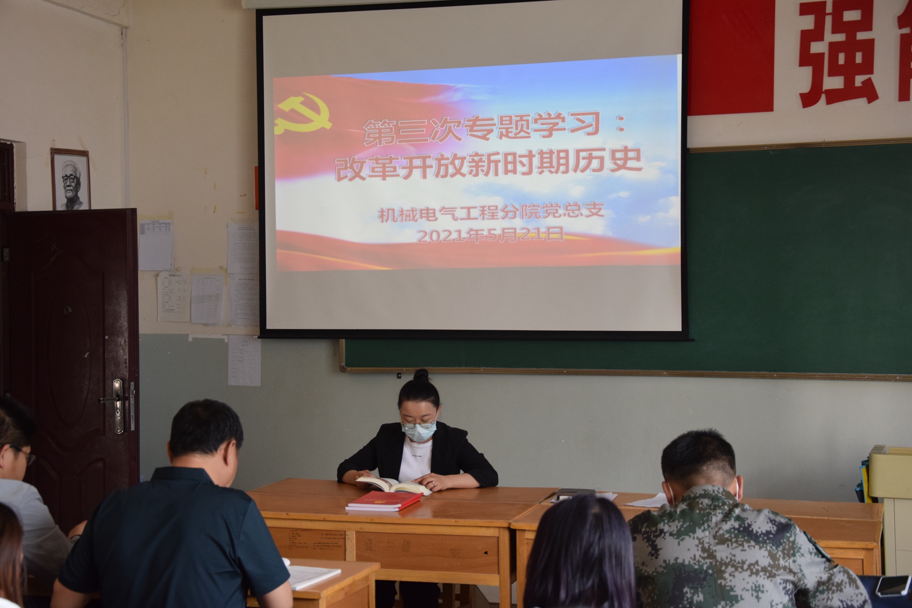 2021年5月21日下午,机电分院党总支召集全体党员在机电楼409教室进行党史教育集中学习,机电分院书记辛延波主持学习。