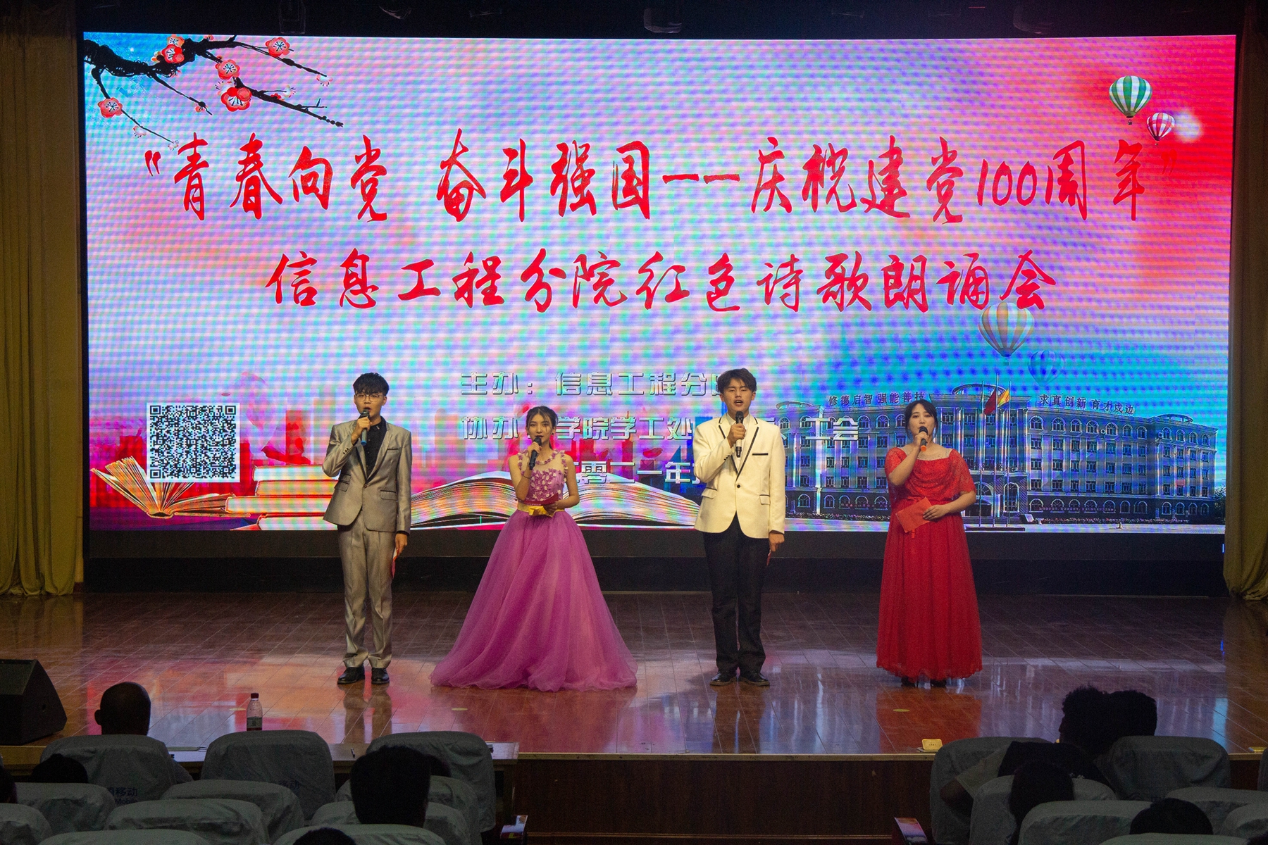 为庆祝中国共产党成立100周年,歌颂党的伟大成就,传承红色基因,坚守初心使命,信息工程分院于2021年6月1日下午6点,在综合楼四楼阶梯教室举办了“青春向党,奋斗强国——庆祝建党一百周年”诗歌朗诵会。