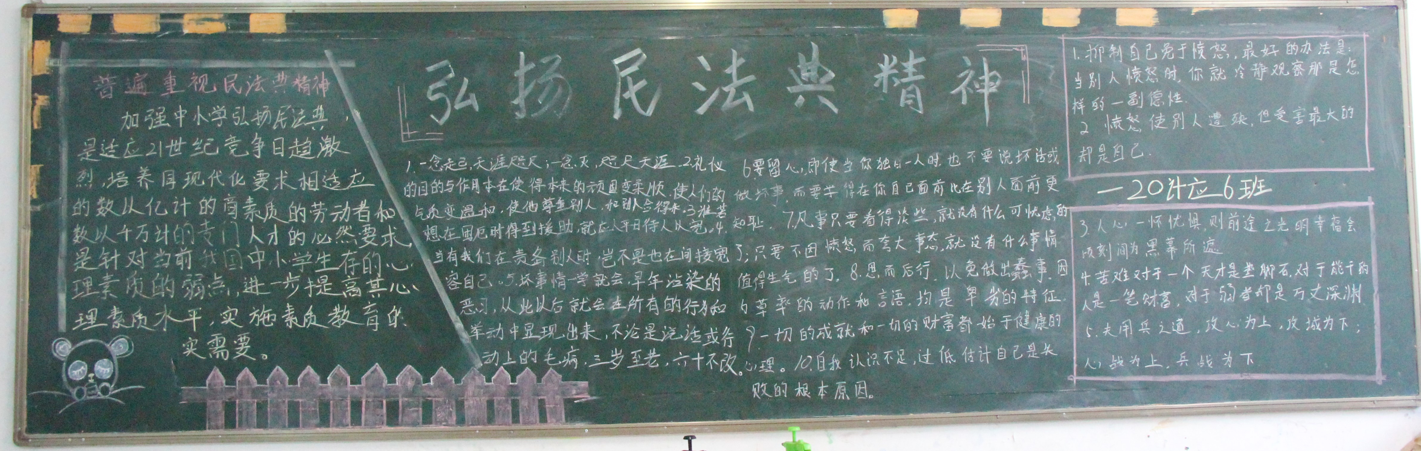 本次活动分别从分院宣传展板、黑板报竞赛、手抄报展示以及主题班会展开。活动开始,各班积极响应号召,认真落实。班会上通过开展青少年学生民法典学习宣传,推动民法典教育全覆盖见实效。同学们纷纷表示要认真诵读和学习民法典原文,了解我国的根本制度,进一步坚定制度自信并厚植爱国主义情怀。最后,各班同学利用黑板报和手抄报,以设计色彩鲜明、内容丰富、字迹工整,作品中全面展示了信息学子对民法典教育的针对性和实效性,合理安排学生学习时间和学习内容。