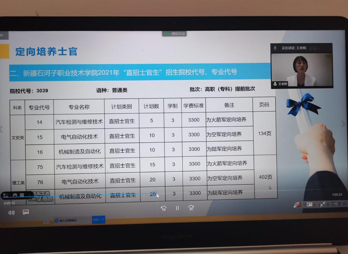 学院通过平台发布了学院简介、专业介绍及往年各专业投档线等内容,并通过文字问答方式,及时解答学生提出的每一个问题。6月27日我院通过视频直播方式对考生及家长进行了直播,招生办薛斌老师就学院的整体情况、定向培养士官、应用型本科“3+2模式”及普通高职进行了详细的介绍。招生办王主任对2021年如何填报高职专科提前批次、高职(专科)批次及填报志愿的注意事项对考生及家长进行了指导,此次直播让考生及家长在填报志愿的有限时间内,更全面地了解我院2021年招生情况。
