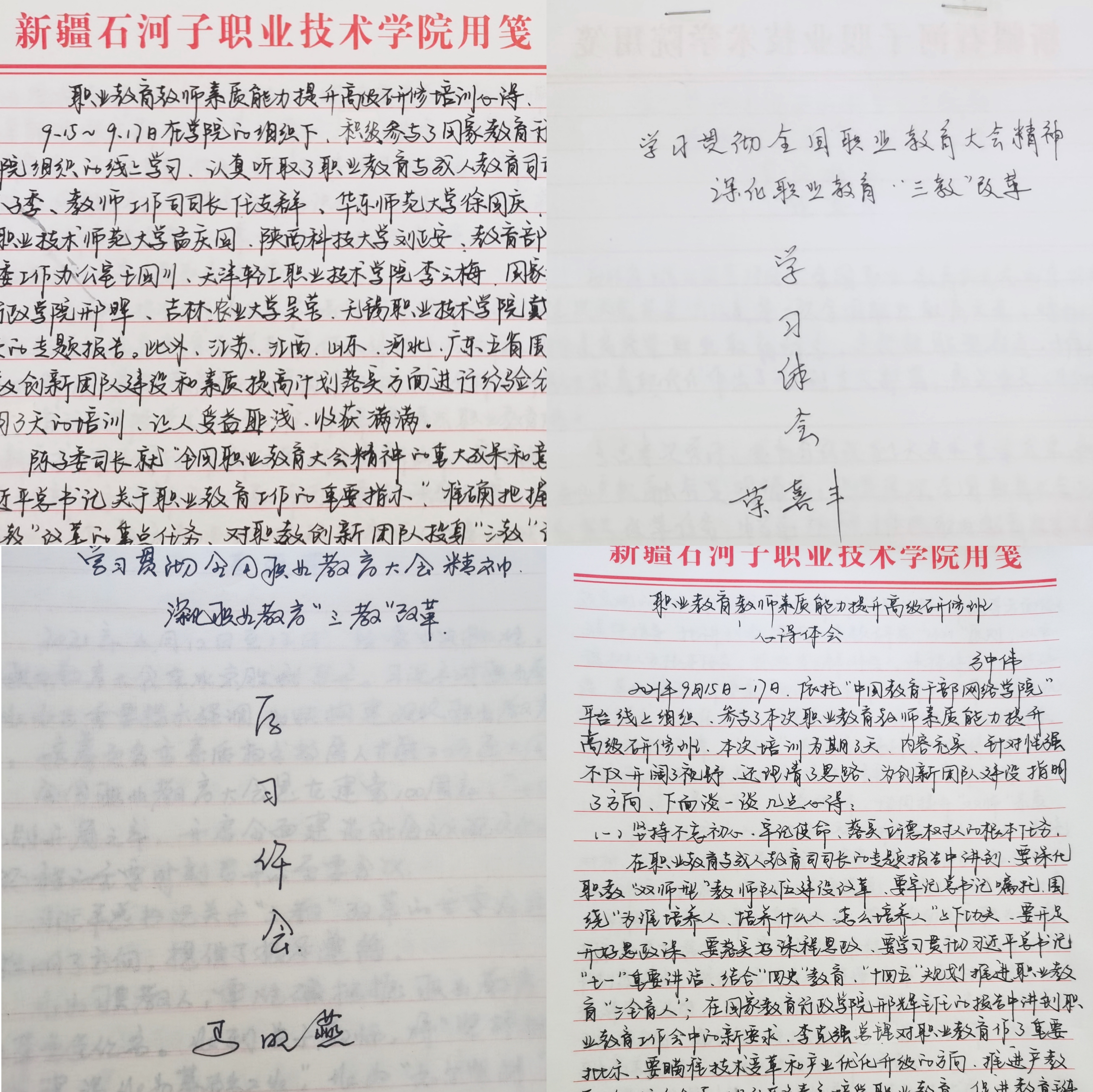 本次培训内容主要围绕学习贯彻习近平总书记关于职业教育的重要论述和全国职业教育大会精神,部署安排第二批国家级职教创新团队建设和素质提高计划实施工作,地方院校和首批团队介绍经验做法,职教创新团队建设和素质提高计划重难点问题等四个方面进行专题辅导和解读。培训内容充实,针对性强,为学员们提供了一个深入学习交流的有效平台,带着满满的收获,大家纷纷撰写心得体会。