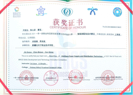 2021年10月17日,由金砖国家工商理事会中方理事会、一带一路暨金砖国家技能发展国际联盟、中国科协一带一路暨金砖国家技能发展与技术创新培训中心主办,中国发明协会、教育部中外人文交流中心联合主办的2021“一带一路”暨金砖国家技能发展与技术创新大赛“智能供配电技术”大赛在郑州电力高等专科学校落幕,来自国内外各级各类中高职院校数百名选手同台竞技,展现风采。学院机电分院电力系统自动化191班学生何国玉、陈北彦、曹强在余丽娟和李洪波老师的悉心指导下参加了此次比赛,荣获2021一带一路暨金砖国家智能供配电技术赛项国内决赛三等奖。