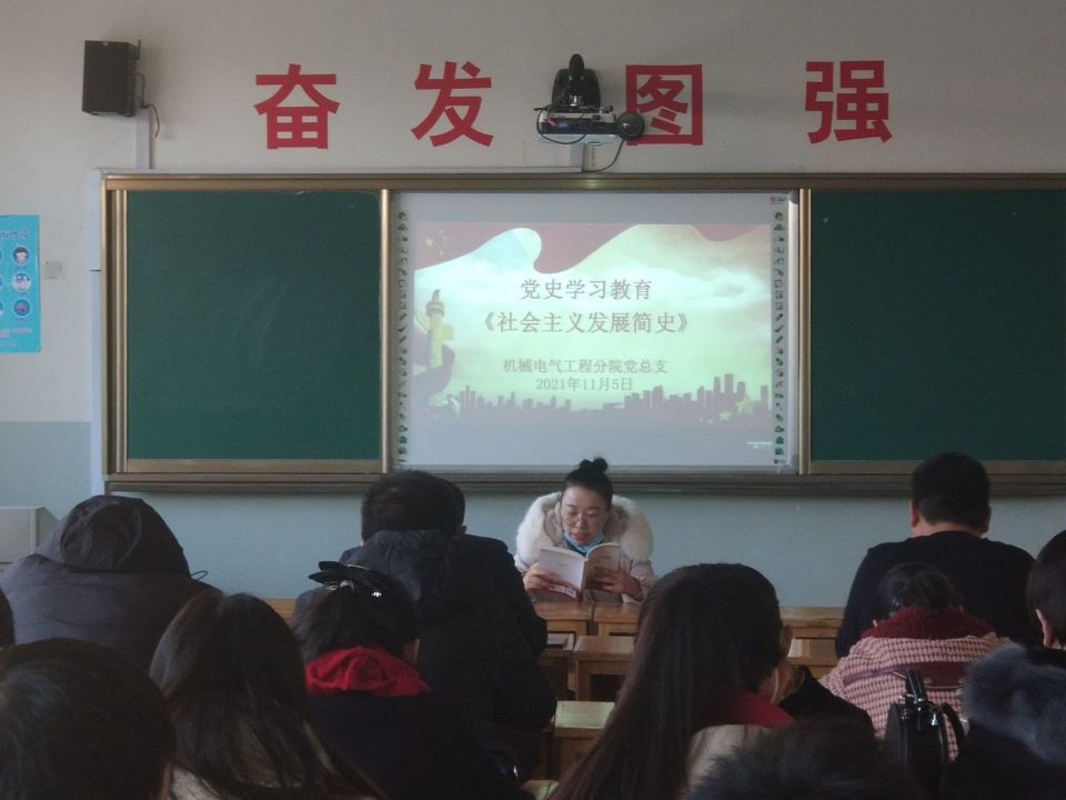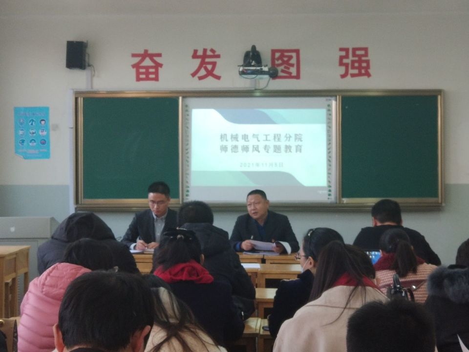 2021年11月5日下午18点,机械电气工程分院召开全体教职工大会,会议由分院党总支书记辛延波主持。张杰老师带领全体教职工学习《社会主义发展简史》;尹君副院长带领全体教职工进行“师德师风专题学习”——学习新时代加强教师队伍建设的关键所在。辛书记对前期工作进行了总结并对班级管理提出几点严格要求,最后对近期分院举办的几项活动:12·9大合唱、迎新晚会、朗诵比赛进行动员。通过学习《社会主义发展简史》,全体教职工更加全面深刻地认识社会主义发展的理论和实践,深刻认识和理解中国特色社会主义来之不易,必须倍加珍惜。通过学习新时代加强教师队伍建设相关文件,大家纷纷表示要充分发挥教师示范作用,坚持教书和育人相统一,坚持言传和身教相统一,坚持潜心问道和关注社会相统一,坚持学术自由和学术规范相统一,在今后的工作中,要注意自己的品德和工作作风,贯彻落实新时代党的教育方针,忠诚于教育事业。