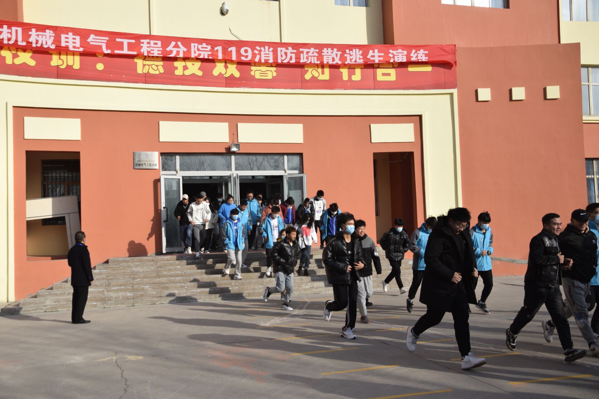 为进一步筑牢学院消防安全“防火墙”,加强消防安全“四个能力”建设,增强全体师生员工的消防安全和自我防范意识,构建平安校园体系,营造安全文明校园,结合兵团教育局《关于开展2021年度“119”消防宣传月活动的通知》精神,机械电气工程分院消防安全工作领导小组按照学院总体要求,通过周密部署于2021年11月9日上午11:40分在机电教学楼组织开展主题为“落实消防责任,防范安全风险”的师生应急疏散逃生演练。