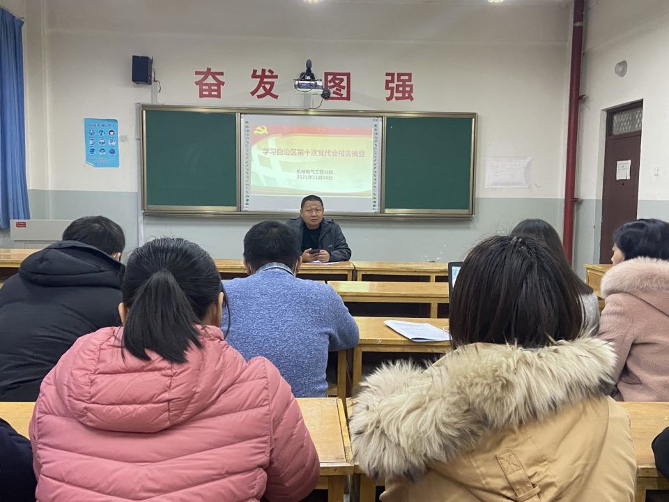 2021年11月16日下午六点,机械电气工程分院党总支全体党员在机电楼215教室集中学习《自治区第十次党代会报告(摘登)》,学习由党总支书记辛延波书记主持。