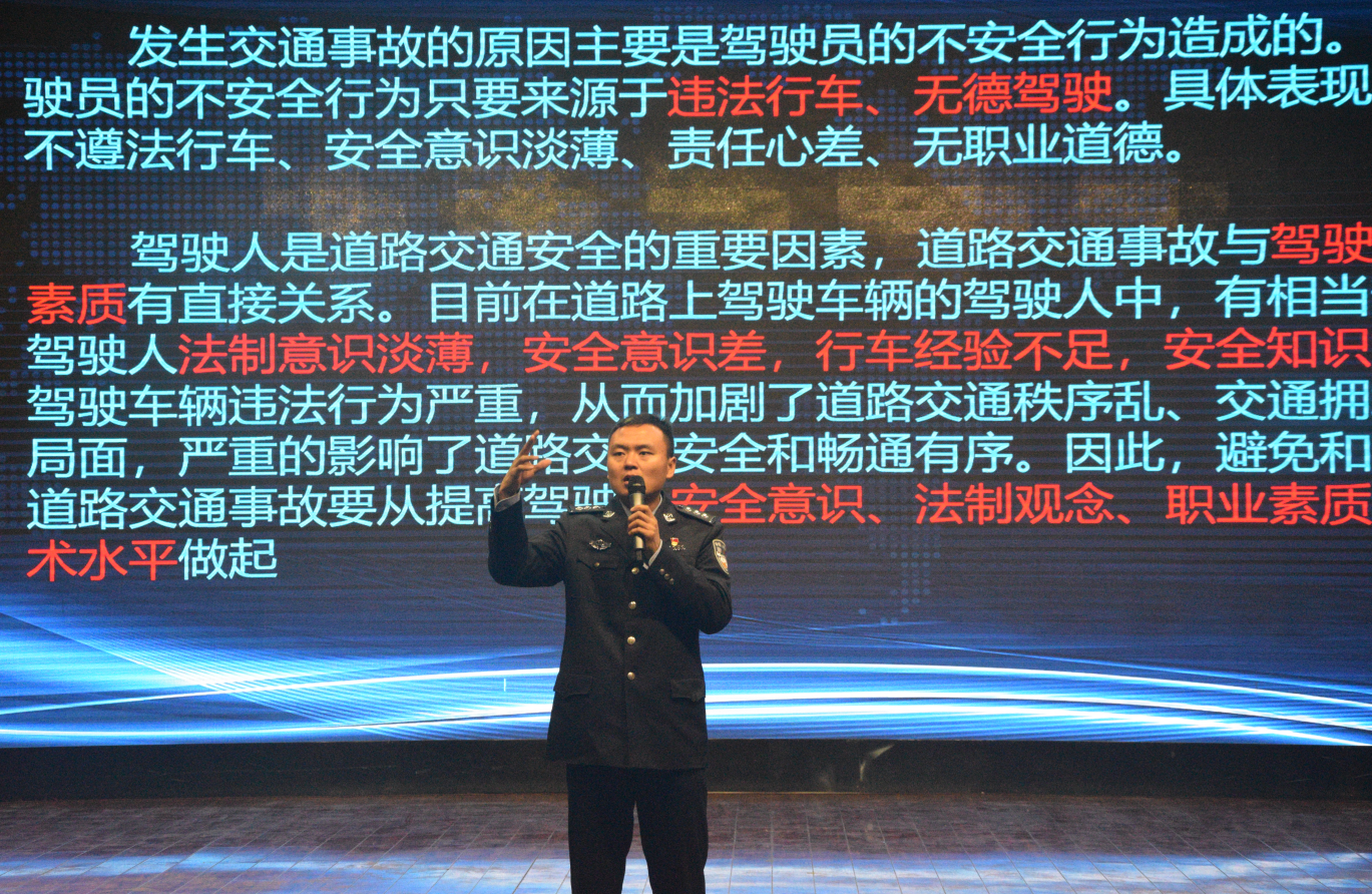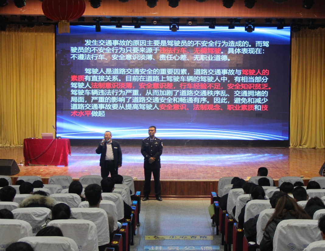 活动中,石河子交警支队魏巍警官通过多媒体向同学们展示了不遵守交通法规而造成的安全事故,让大家认识了不文明交通行为的危害。随后魏警官向大家阐述了遵守交通法规、维护交通安全对我们学习与生活的重要意义,对学生室外活动、步行、乘坐各类交通工具、处理交通事故等方面应该注意的问题进行了强调,并结合交通违规案例进行分析,用血的事实为同学们深入分析违反交通规则、违背交通道德带来的种种危害,呼吁在座的每一位同学要丰富交通安全知识,增强防范意识,遵守交通安全法规,提高自我保护能力。学院保卫处处长杨春对本次活动进行了点评和总结,并对魏巍警官表示了感谢。