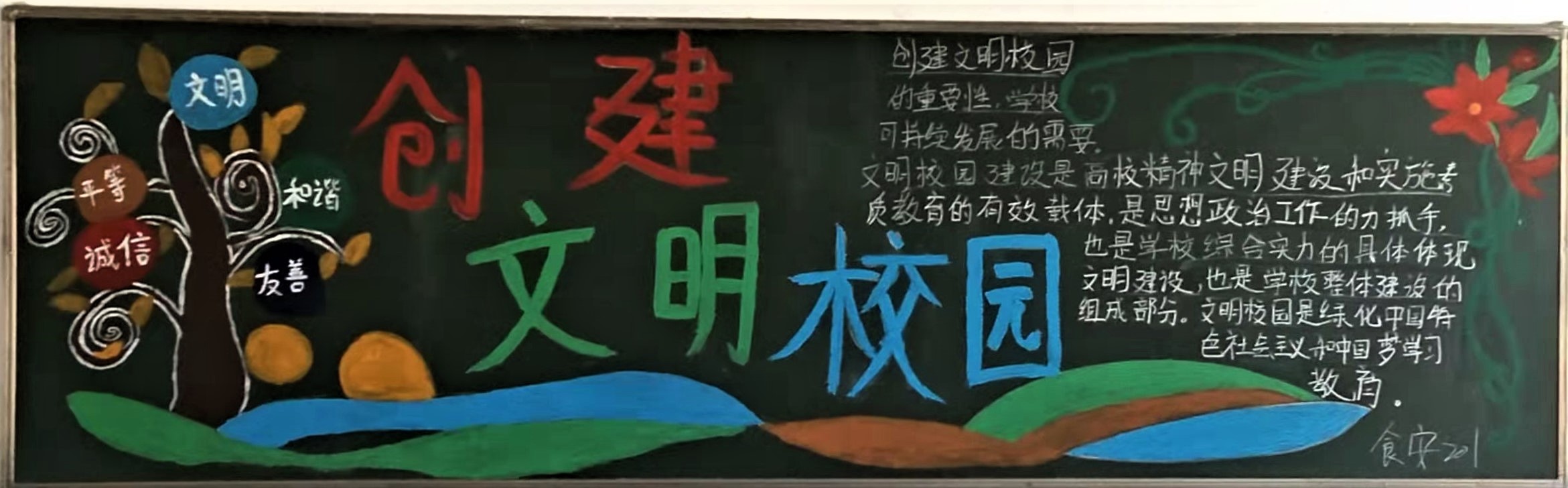分院团总支学生会展出“创建文明校园”主题宣传展板,营造良好宣传氛围。活动共征集了60余份手抄报作品,其中十余份手抄报脱颖而出获得优胜奖,手抄报比赛中同学们通过搜索素材了解文明校园知识和建设文明校园的重要意义。同学们利用晚自习进行了“创建文明校园”的主题黑板报评比,服装211班、食检202班脱颖而出,获得比赛第一名。此外,分院18个在校班级召开了“创建文明校园 争做文明学子”主题班会,各班利用主题班会组织师生不断深入学习贯彻习近平新时代中国特色社会主义思想,深入开展培育和践行社会主义核心价值观教育活动,牢牢把握立德树人这一根本任务,培养时代新人。