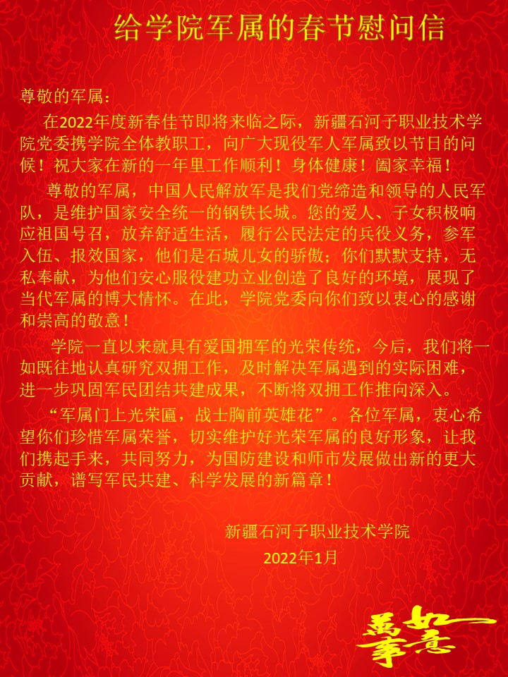 2022年度新春佳节即将来临之际,beat365唯一官方网站党委书记史文革、院长林炯,副院长耿荣、李卫、张涛,纪委书记晁利君等分组带队,对学院离退休干部、兵团英才、师市拔尖人才、支教老师、生活困难教职工、军属、困难退役军人等进行了走访慰问,向他们致以亲切的问候和新春的祝福。