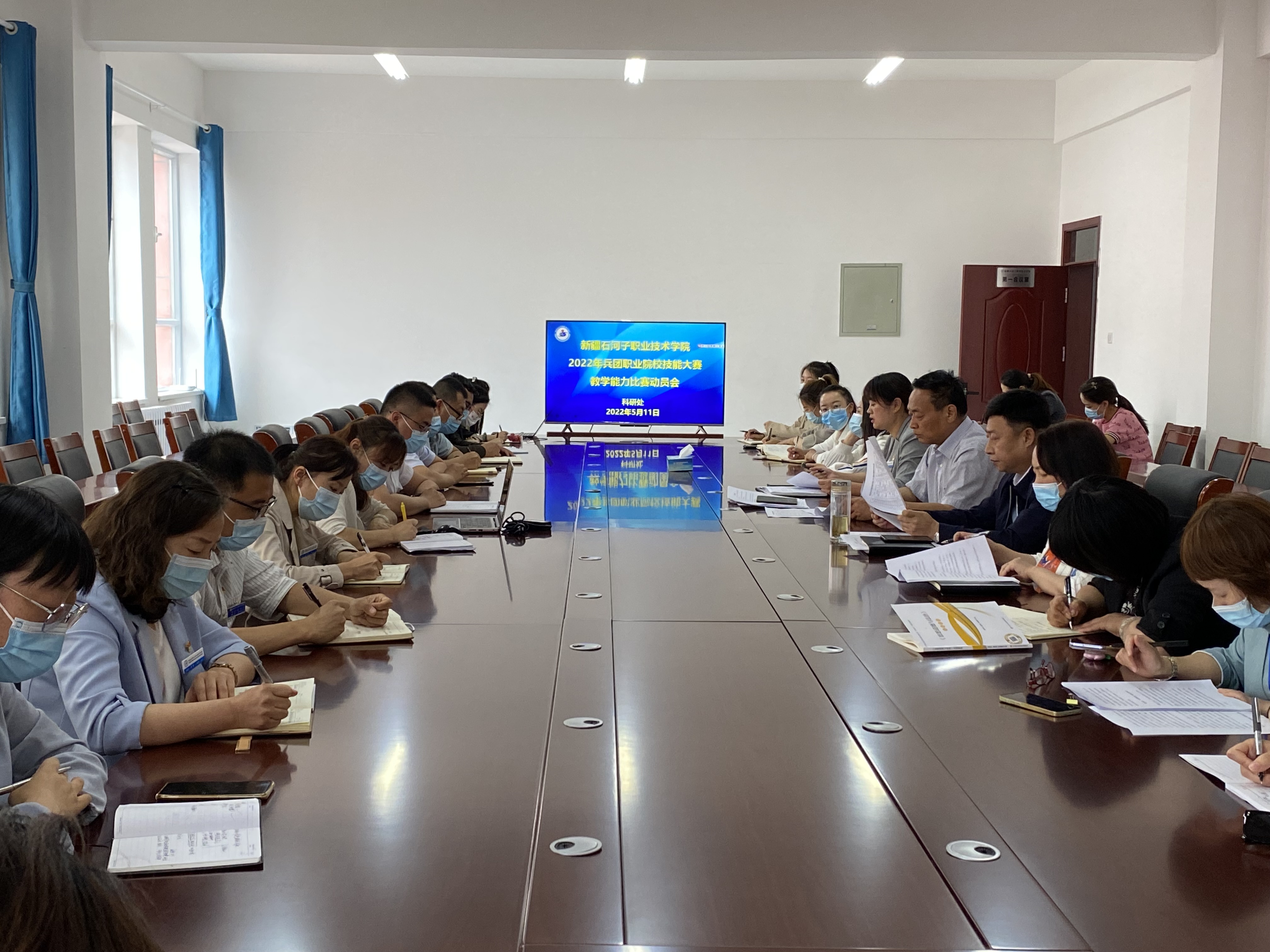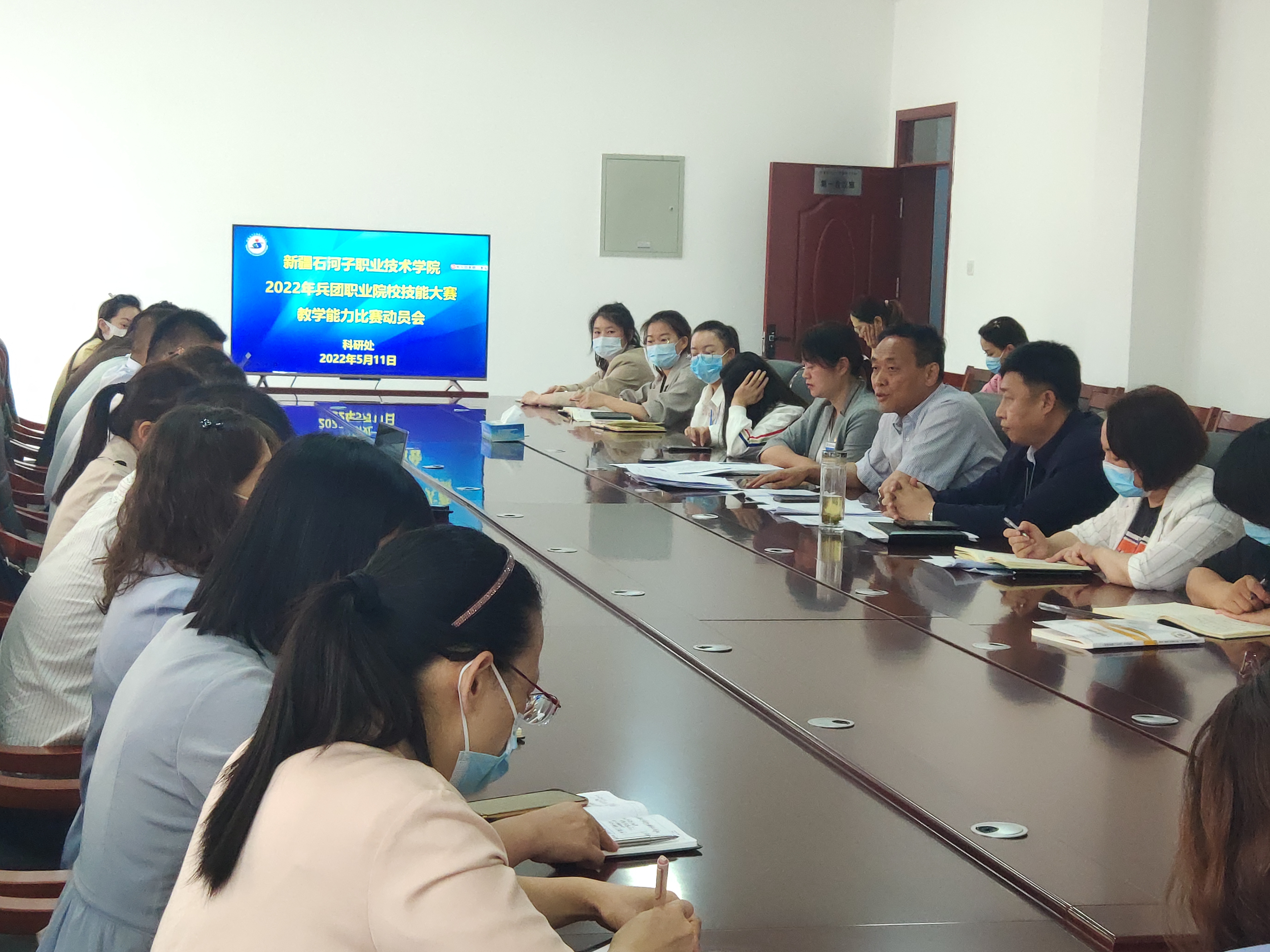 (尚明东报道)为提升教师教学能力水平,积极备赛兵团职业院校技能大赛教学能力比赛,5月11日下午,学院在新办公楼三楼会议室召开赛前动员会。学院党委书记史文革、学院院长林炯、学院副院长马彩梅、科研处处长胡英、各分院院长和各兵团赛参赛负责人参加了会议。会议由学院副院长马彩梅主持。