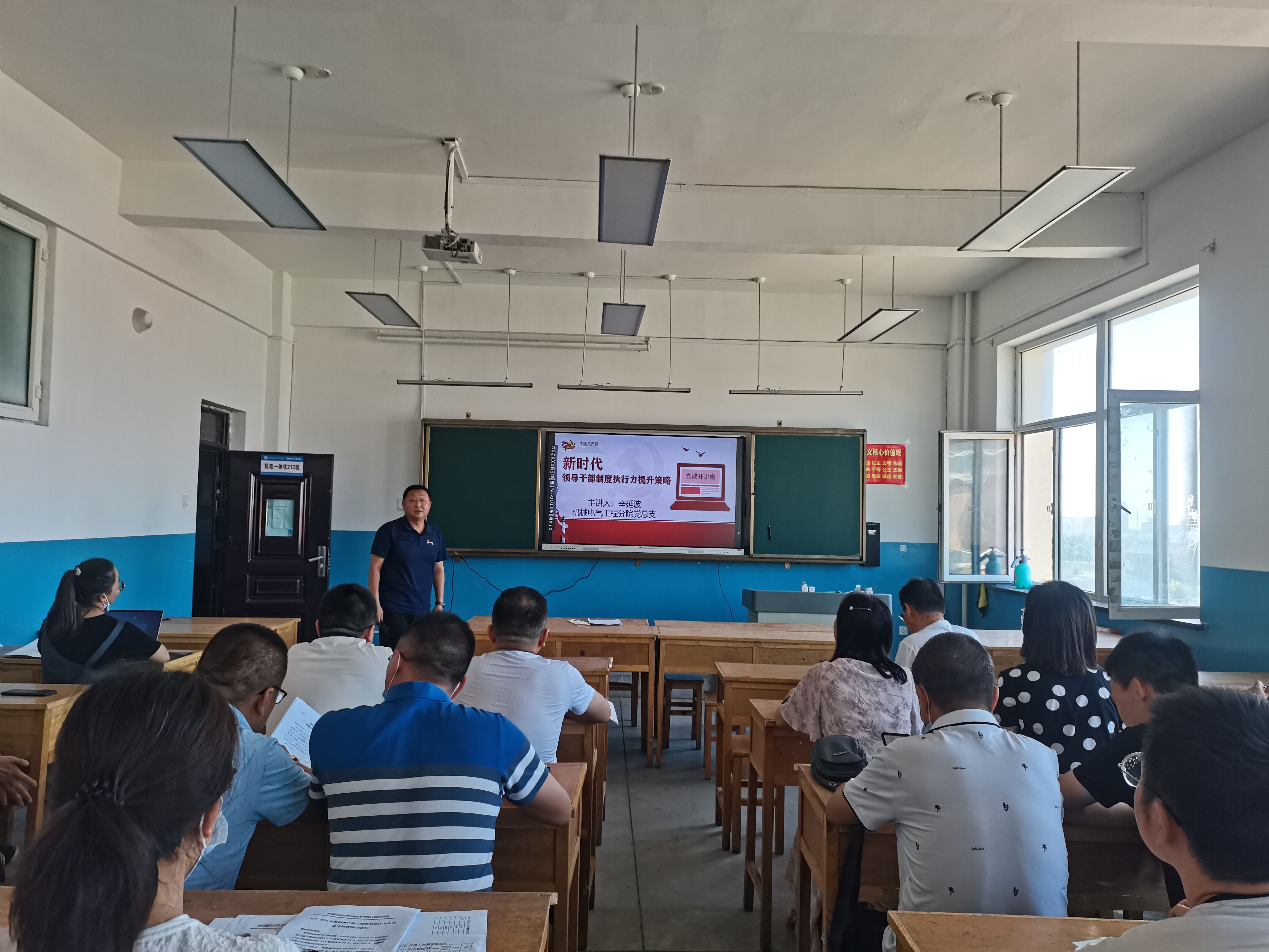 会议第二项,由辛延波书记给全体党员上了一堂生动的党课——“新时代领导干部制度执行力提升策略”,辛书记指出,领导干部是我国执政理政的中坚力量,各项社会制度要落地生根,实效关键在于抓落实,强化执行问责,改善执行环境,有效优化制度,执行保障。