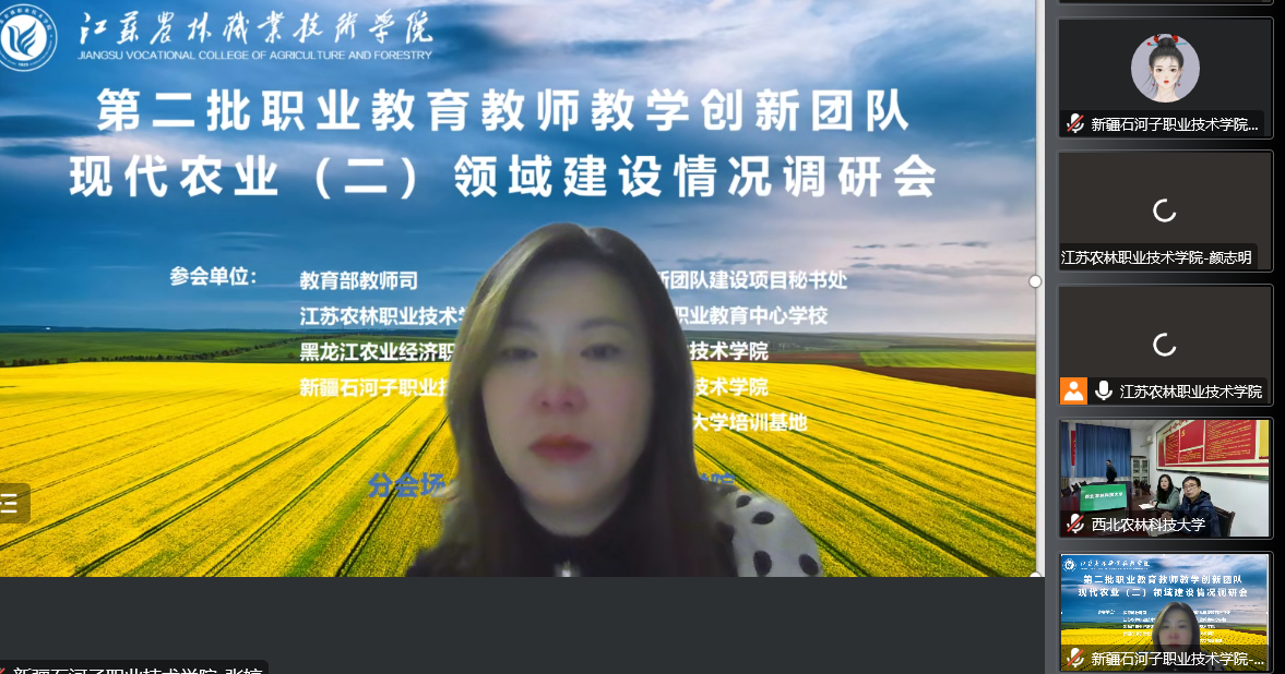 我院现代农业创新团队负责人张婷副院长就团队建设计划完成情况、具体开展情况、存在的主要问题和取得的成果经验四方面进行了汇报。重点围绕师德师风、“三全育人”、教学标准、职业技能等级标准、课程体系重构、课程开发技术、模块化教学设计实施等内容,突出创新团队自身建设全方位提高创新团队教师能力素质。通过理论培训、企业实践提高教师自身的能力。本着工学结合、能力为本的基本指导思想,以能力为导向,重构课程内容,建设贴近生产,贴近技术、贴近工艺的网络课程资源。打破学科教学传统模式,重构课程体系,引入行业企业的实际案例,通过新型活页式教材的开发,在线精品课程资源的建设,线上线下混合式教学模式改革等方式形成各具特色的教学风格,不断提升育人质量效果。