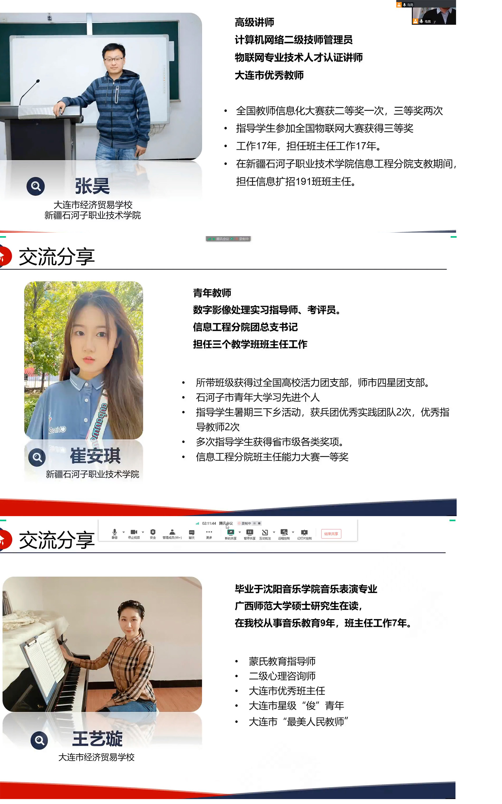 活动开始,首先双方院校领导致辞。大连市经济贸易学校党委书记李健平表示,辽疆两校领导和老师一起相聚云端、共话教育,是大海与天山的又一次携手,是职业教育人的又一次果敢尝试。感谢beat365唯一官方网站的领导老师对援疆乌亮、张昊两位老师的关心、帮助和支持,更为重要的是,通过两位教师的援疆之旅,在辽宁和新疆两所学校间搭建起了一座友谊的桥梁,大家相聚在一起,集体教研、相互学习、共同提高。信息工程分院党支部书记马晓燕感谢援疆教师把教育新理念、新模式带到学院,为打造一支带不走、留得住的教育人才队伍做出了积极贡献,希望未来两校能够继续开展交流合作。她表示,希望通过交流活动进一步提升班主任队伍建设,促使班主任工作管理向规范化、科学化发展,真正促进班主任的专业成长。