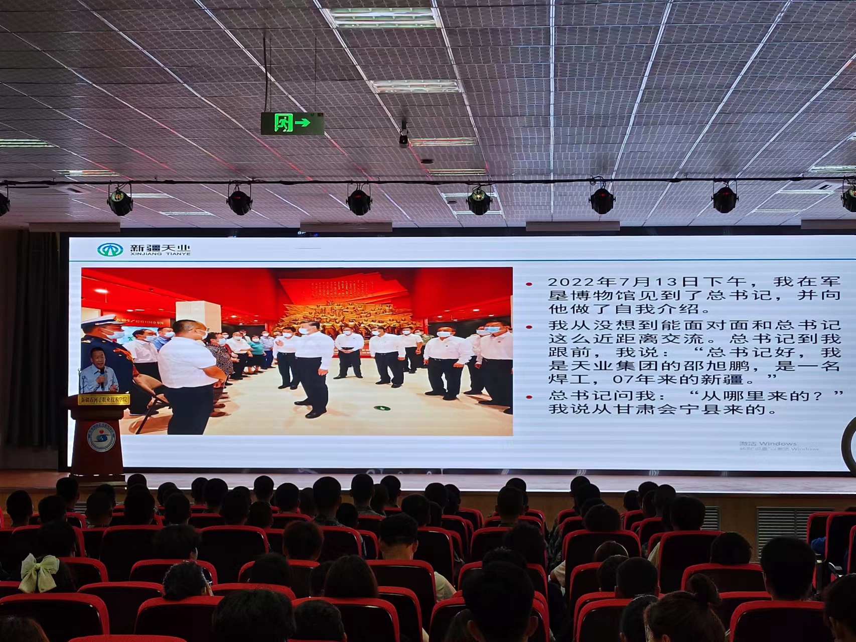 2022年7月,邵旭鹏作为兵团老中青三代建设者代表中的一员在新疆兵团军垦博物馆受到了习近平总书记的接见。作为职教周活动的重要内容,学院特地邀请邵旭鹏来为大家讲述一个“90后”的年轻电焊工如何通过自己10多年的努力奋斗从普通技术工人成长为高级技师,并获得国务院政府特殊津贴的成长历程。邵旭鹏说总书记的讲话在情深意切中催人奋进,他作为一名兵团职业院校培养的技术人员,一定会握好前辈们的接力棒,继续弘扬劳模精神、劳动精神和工匠精神,把技能传承好,为建设更强大更繁荣的兵团添砖加瓦,贡献自己的青春力量。他勉励大家,职业院校的学生要有明确的人生规划,勤学苦练才能真正拥有一技之长,成为一名合格的技能人才,唯有如此,才能不负家人的殷切期望,不负自己的青春梦想,真正创造属于自己的辉煌人生。他用朴实亲切的话语,以自己的实践经验、丰富的人生阅历、执着的理想追求阐释了技能大师的成功之路,赢得了同学们的阵阵掌声。讲座结束后,同学们纷纷表示,听了邵旭鹏大师的讲座受益匪浅,他的成长让自己对兵团精神与工匠精神的内涵有了更加深刻的理解,也有了更加明确的奋斗目标和清晰的职业规划,表示要学习邵旭鹏大师积极投身边疆乡村振兴、经济发展,为区域经济发展贡献力量。