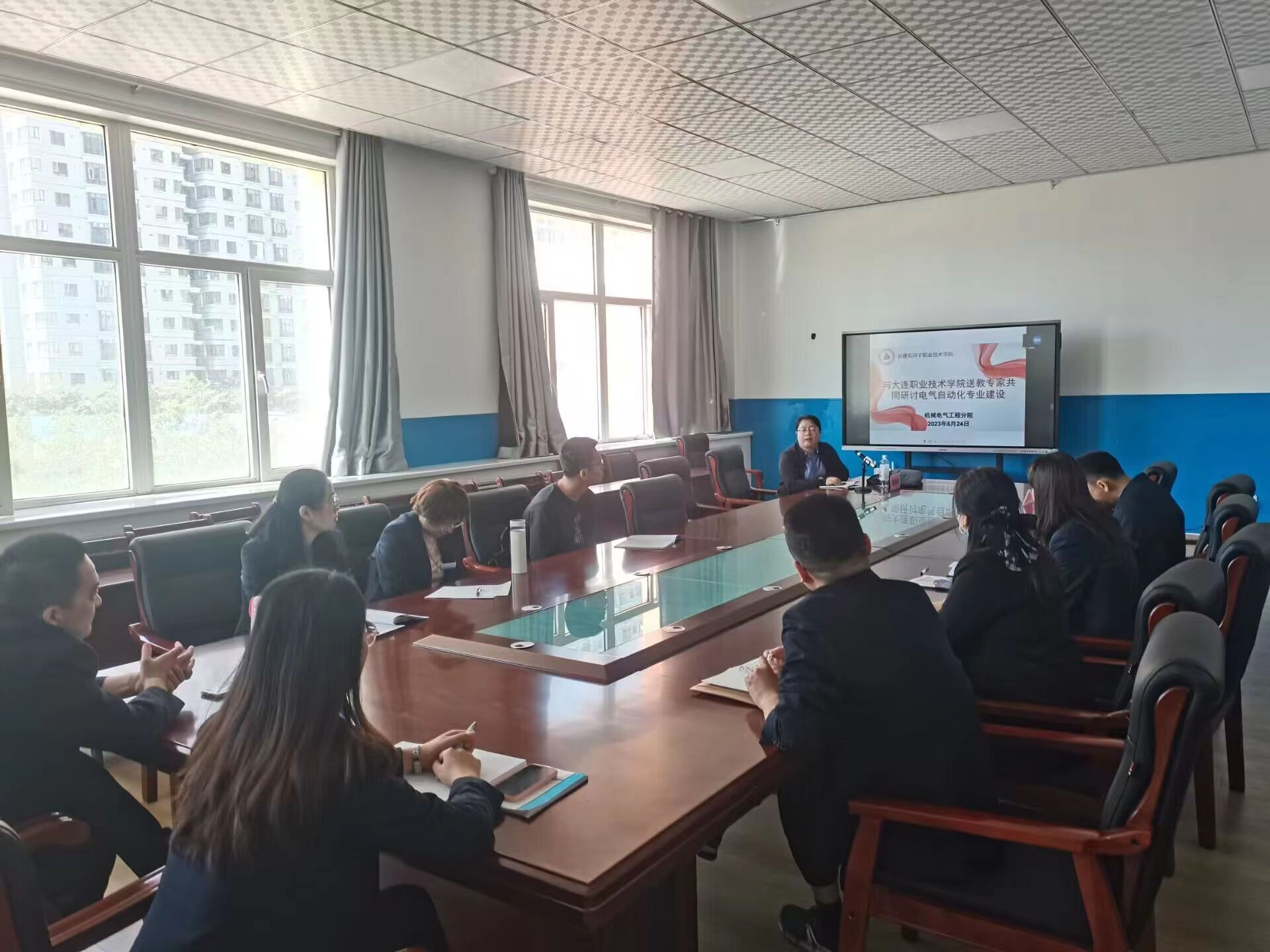 讲座结束后,邀请陈晓娟主任参与教研室研讨活动,结合我院电气自动化专业师资队伍建设、教师能力提升、技能大赛培训、教师下企业实践、1+X书证融通的实施等具体情况与陈晓娟主任进行深入研讨。通过本次研讨活动,陈晓娟主任对电气自动化专业新入职教师如何快速成长、如何针对1+X书证融通进行课程设置、如何依托技能大师工作室建设精英训练营进行卓越培养、综合育人给出了建设性意见。