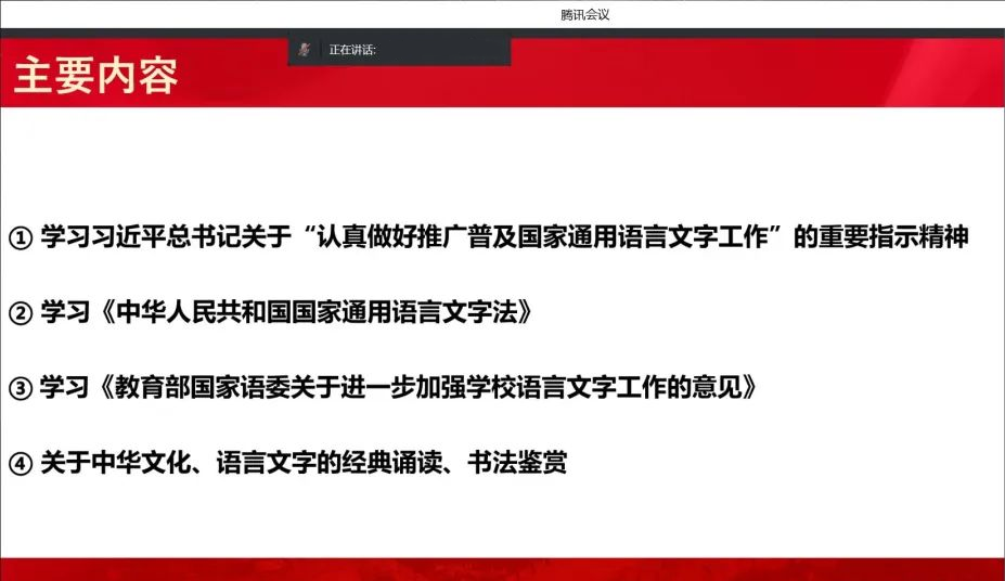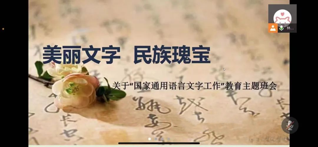 为深入贯彻实施《中华人民共和国国家通用语言文字法》及我省《实施办法》,全面提高我院通用语言文字的普及程度和发展质量,我院组织全院各年级于9月12日-18日开展“国家通用语言文字工作”教育主题班会,班会通过线上会议的形式进行。