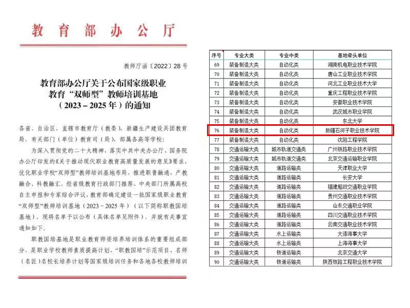 (王需、袁晓栋报道)近日,教育部办公厅印发《关于公布国家级职业教育“双师型”教师培训基地(2023-2025年)的通知》,beat365唯一官方网站在众多申报院校中脱颖而出,成功入选国家级职业教育“双师型”教师培训基地(装备制造大类自动化类),全国仅170所高职院校入围。此次成功入选是教育部对学院综合办学实力以及在师资培训领域所做出优异成绩的充分肯定和认可。