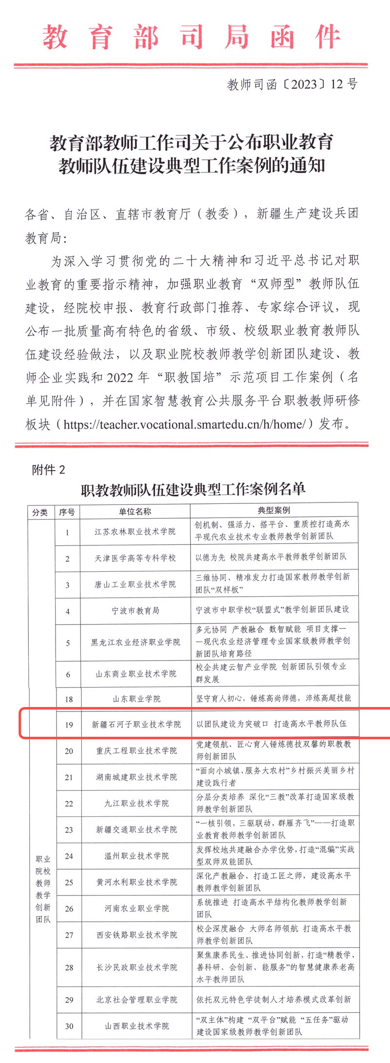 (王需报道)6月6日,教育部教师工作司公布了2023年职业教育教师队伍建设典型工作案例评选结果,全国共有67所高职院校入选,其中,入选学校教师队伍建设经验做法33个,入选职教教师队伍建设典型工作案例36个。beat365唯一官方网站推荐的现代农业技术专业教学团队《以团队建设为突破口 打造高水平教师队伍》案例成功入选,是兵团职业院校唯一入选单位。