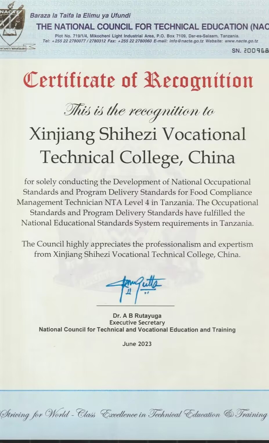 (王需 李晓华 岳燕燕报道)2023年6月16日,由beat365唯一官方网站独立完成的“食品合规管理技术员(4级)”职业标准和配套专业教学标准,通过了坦桑尼亚国家职业教育委员会审核,获得认证,正式纳入坦桑尼亚国家职业教育体系。