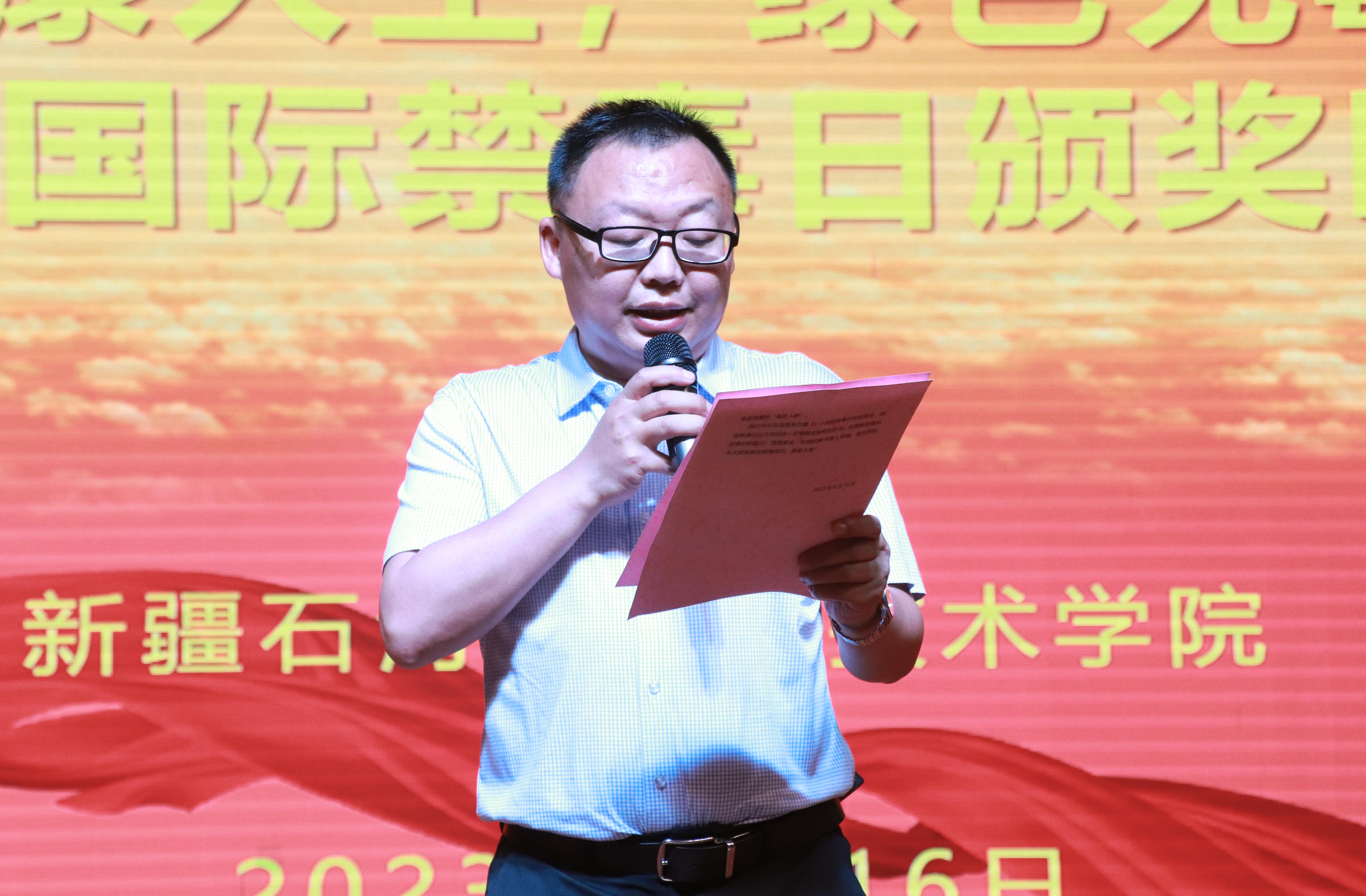 2023年6月16日,学院举行“6.26国际禁毒日”颁奖晚会,学院副院长万祥军、东三路派出所民警李京繁、各部门各分院师生代表300余人参加晚会。颁奖晚会以“健康人生 绿色无毒”主题,在旅游与经济管理分院表演的舞蹈《声纳曲》中拉开序幕,寓教于乐的情景剧《心戒》《诱惑》《别想得逞》,诙谐幽默的小品《悔改》《悔恨泪》《拒绝校园诱惑》,诗歌朗诵《国民当自强 远离毒侵害》等丰富多彩的节目依次上演,最后在欢快的舞蹈《哈尼宝贝》表演下结束了晚会。