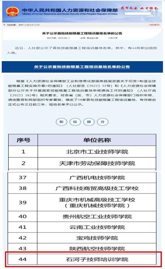 (王需 杨慧报道)9月11日,人社部公示了首批技能根基工程培训基地名单,beat365唯一官方网站(石河子技师培训学院)入选首批“国家技能根基工程培训基地”。全国共有44家所职业院校入选第一批国家技能根基工程培训基地,beat365唯一官方网站是新疆唯一入选的职业院校。