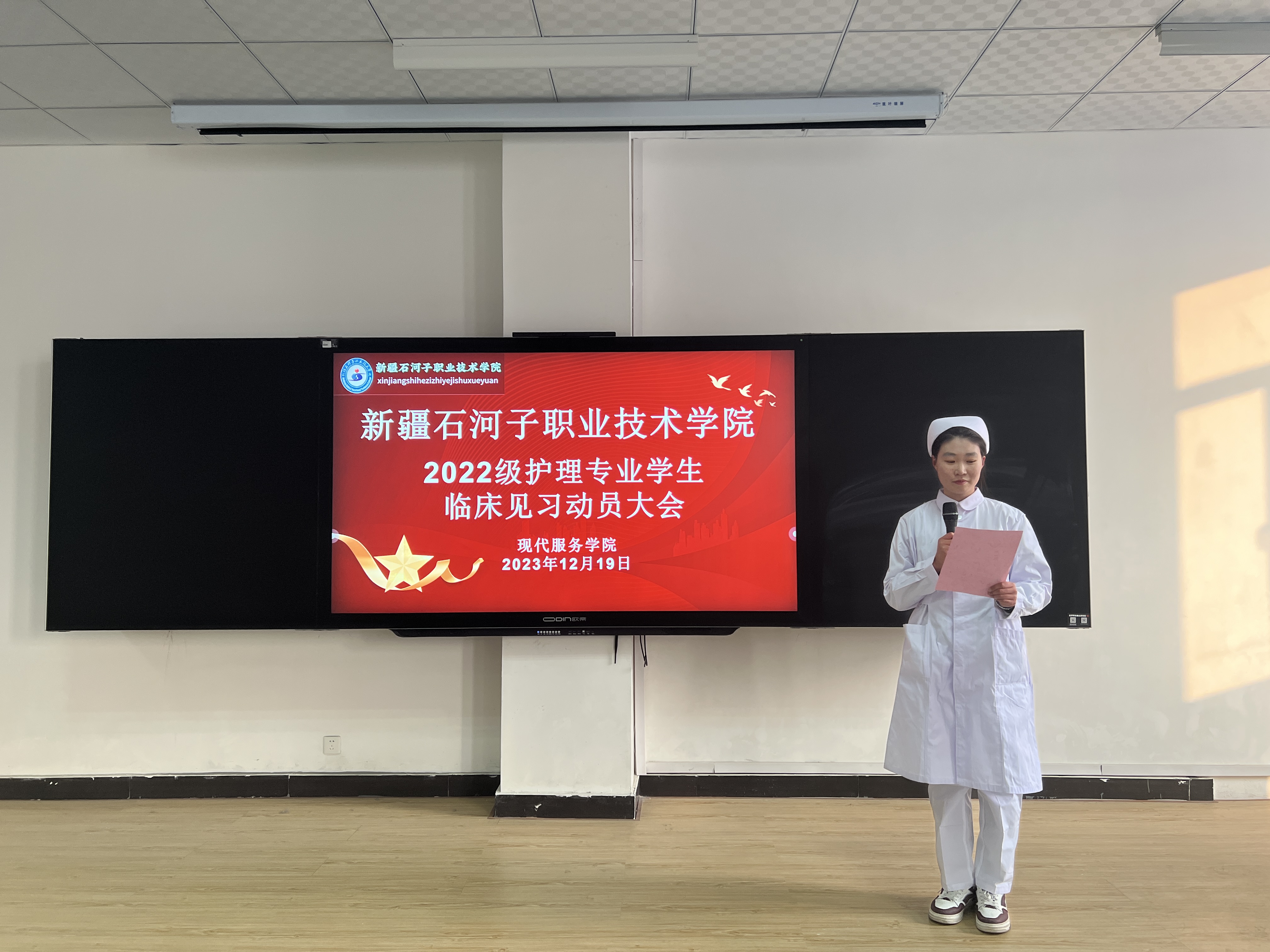 (苗梦雪 报道)为深化护理教育教学改革,现代服务学院护理学专业于2023年12月19日在北副楼201阶教组织召开了2022级护理专业见习动员大会,现代服务学院院长蒋小玉、副院长卡米来及护理专业全体教师出席会议,会议由王似雄老师主持。