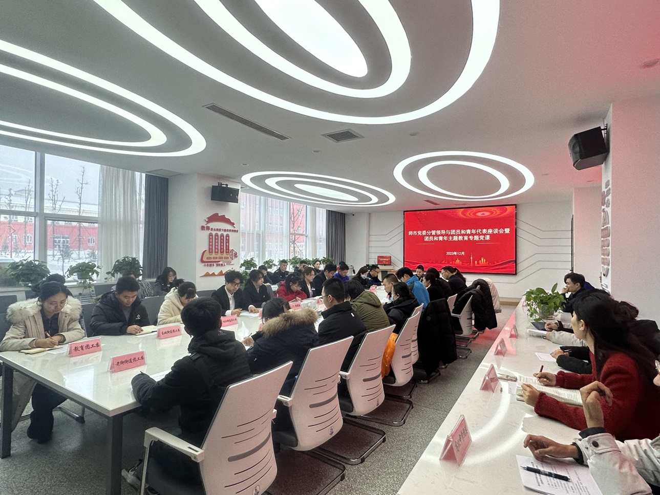 (黎丽 报道)2023年12月22日上午,师市党委分管领导与团员和青年代表座谈会暨团员和青年主题教育专题党课在我院创客大学举行。师市党委常委、副政委,组织部部长、党校校长李平,师市团委副书记张媛,学院纪委书记万祥军,师市团委兼职副书记、教育团工委书记,教育局办公室、人事、发改规划科科长黄兴出席会议,本次座谈会暨专题党课共有50余名直属团组织书记代表、各行业优秀团员和青年代表参与,会议由师市团委副书记张媛主持。