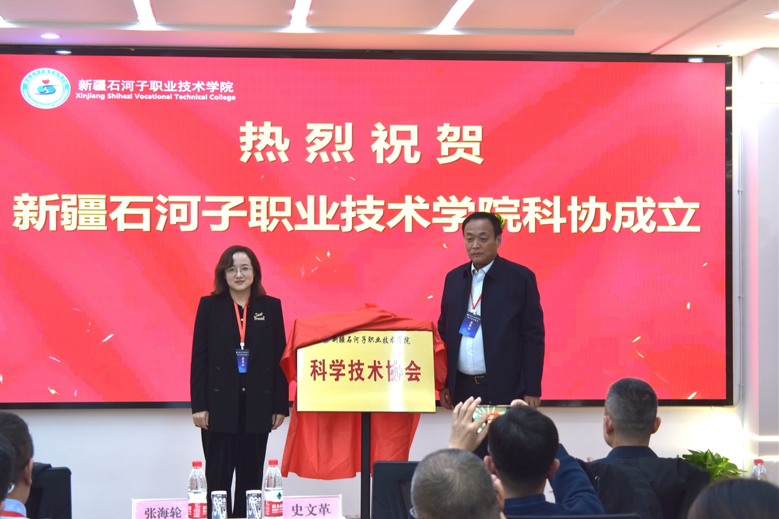张海轮副主席与史文革书记共同为学院科协揭牌。在与会成员的共同见证下,表决通过了科学技术协会章程、第一届委员会领导机构,选举产生了学院科协委员会主席、常务副主席、副主席、秘书长、副秘书长。